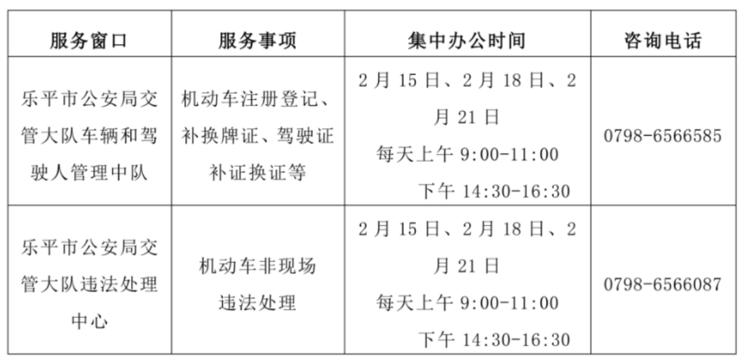 2026年春节将至,为方便外出务工、经商、求学返乡群众办证办事,确保错时延时服务不间断,乐平市城区交管窗口于节日期间积极开展错时延时办公。具体如下: