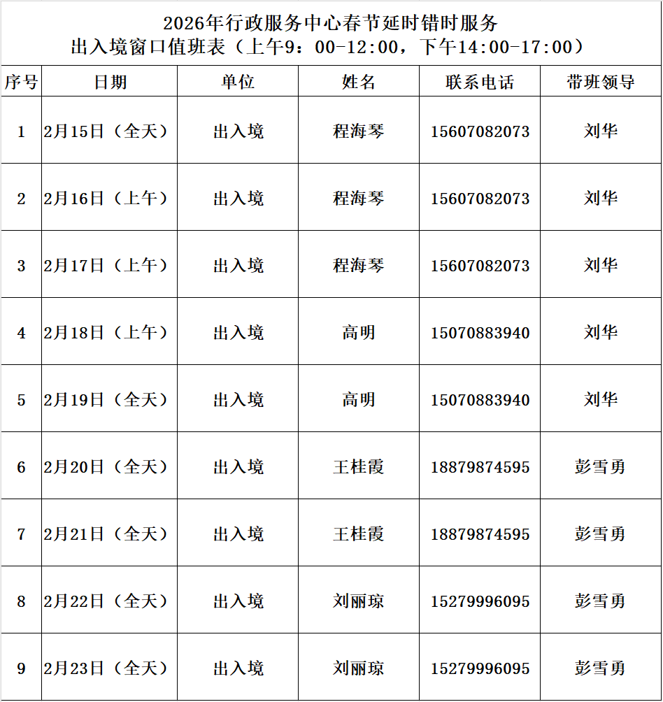 2026年行政服务中心春节延时错时服务出入境窗口值班表