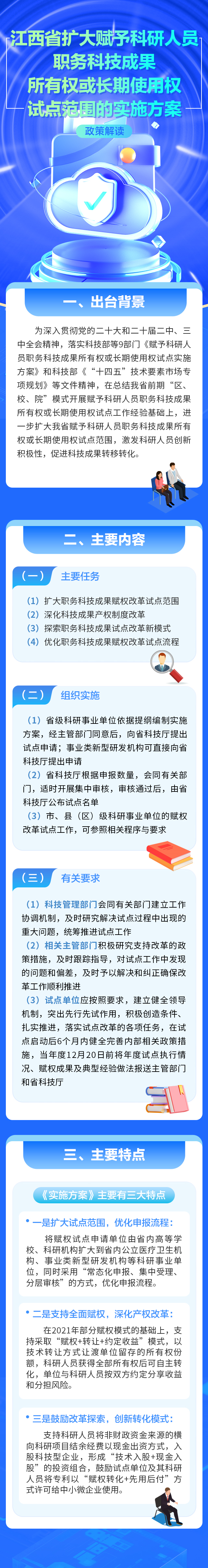 一图读懂 |《江西省扩大赋予科研人员职务科技成果所有权或长期使用权试点范围的实施方案》政策解读