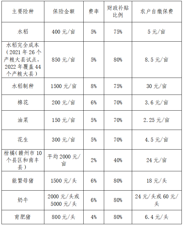实施范围及补助标准:由2008年最初的3个扩大到目前的9个,包括水稻、油菜、花生、棉花、能繁母猪、奶牛、育肥猪、柑橘以及水稻制种等,其中我省水稻制种保险从2019年1月1日起,纳入中央财政保险费补贴目录,每亩保险金额1500元,财政资金承担75%,投保人承担25%;将全省水稻保险金额提高至每亩400元,保险费率由6%调整为5%,农户自担部分调整为25%。除柑橘保险主要集中赣州市10个县区和抚州市南丰县试点,其余保险产品均已经在全省范围内开办。2021年在26个产粮大县开展水稻完全成本保险试点,2022年扩展至全部44个产粮大县,保险金额每亩850元,财政资金承担80%,投保人承担20%;2021年开展省级地方特色农业保险试点,将蔬菜、中药材、油茶纳入试点范围,2022年新增肉牛、柑橘、淡水养殖纳入试点,财政资金承担75%,投保人承担25%。