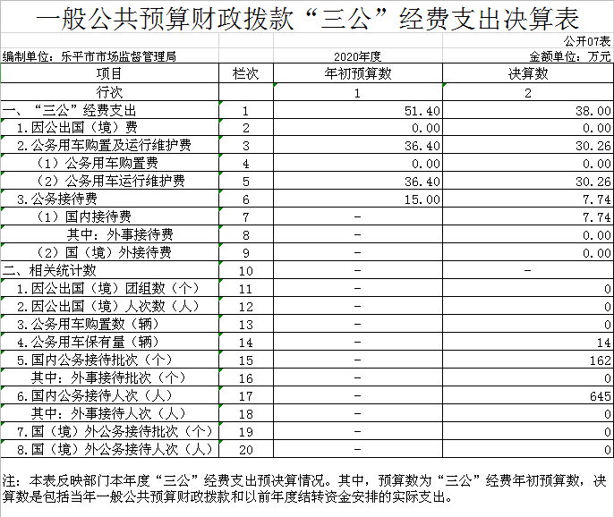 本部门2020年度一般公共预算财政拨款“三公”经费支出年初预算数为51.4万元,决算数为38万元,完成预算的73.93%,决算数较2019年增加1.28万元,增长3.48%,其中: