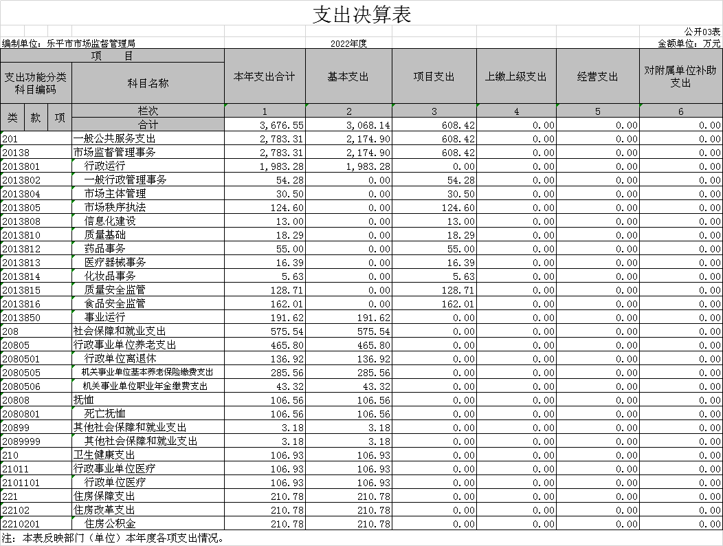 1、一般公共服务(类)市场监督管理事务(款)行政运行(项):反映行政单位(包括实行公务员管理的事业单位)的基本支出。
