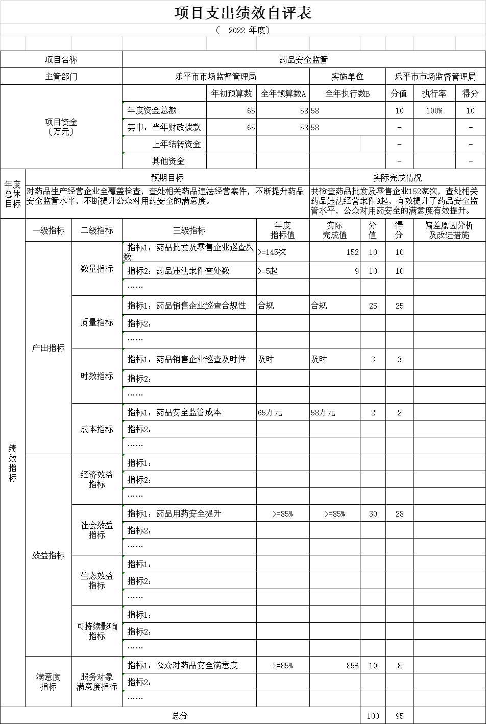 按照市财政局的统一部署。现选取药品安全监管项目和市场秩序执法项目两个项目《项目支出绩效自评表》进行公开如下: