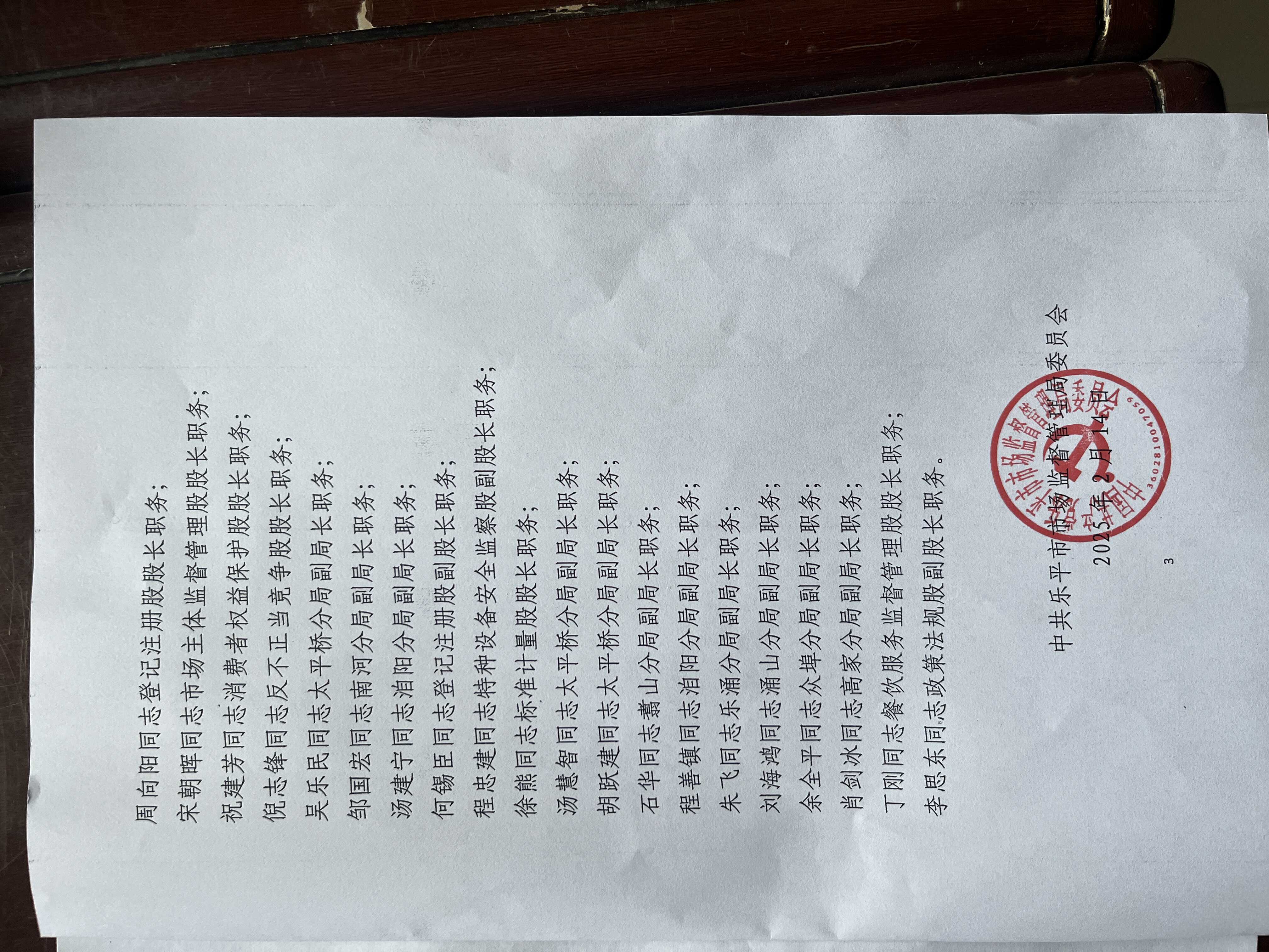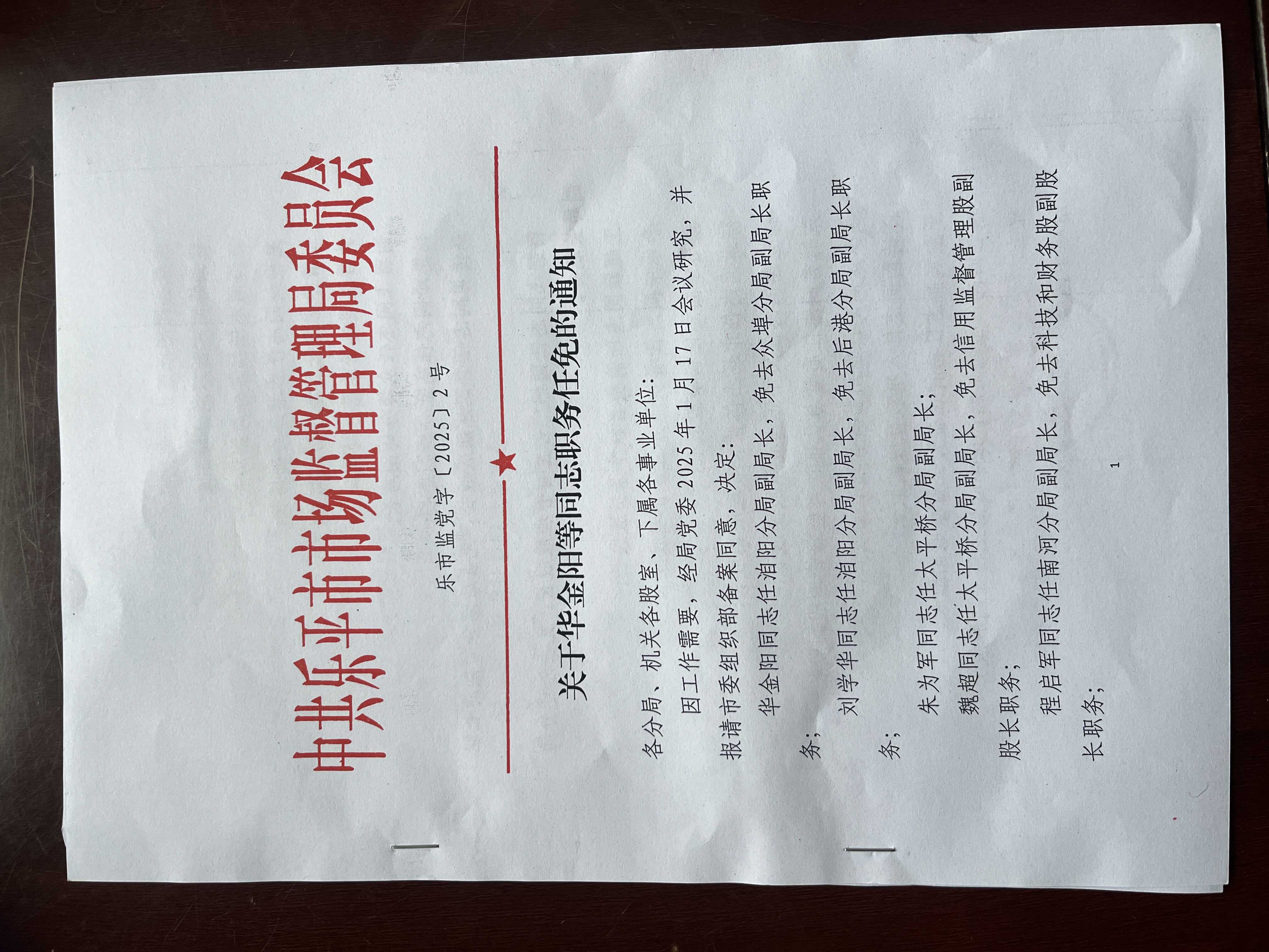 中共乐平市市场监督管理局委员会关于华金阳等同志职务任免的通知