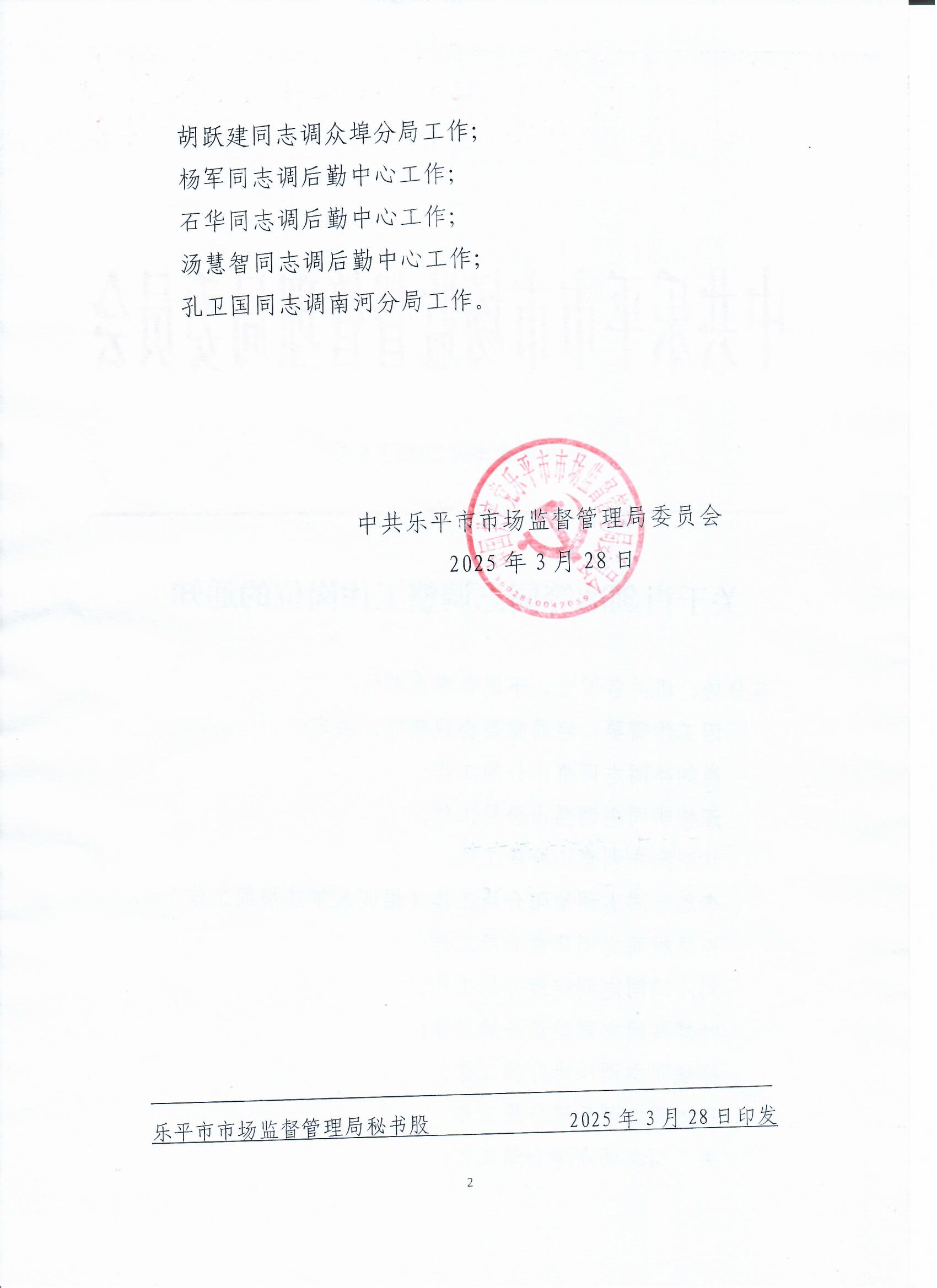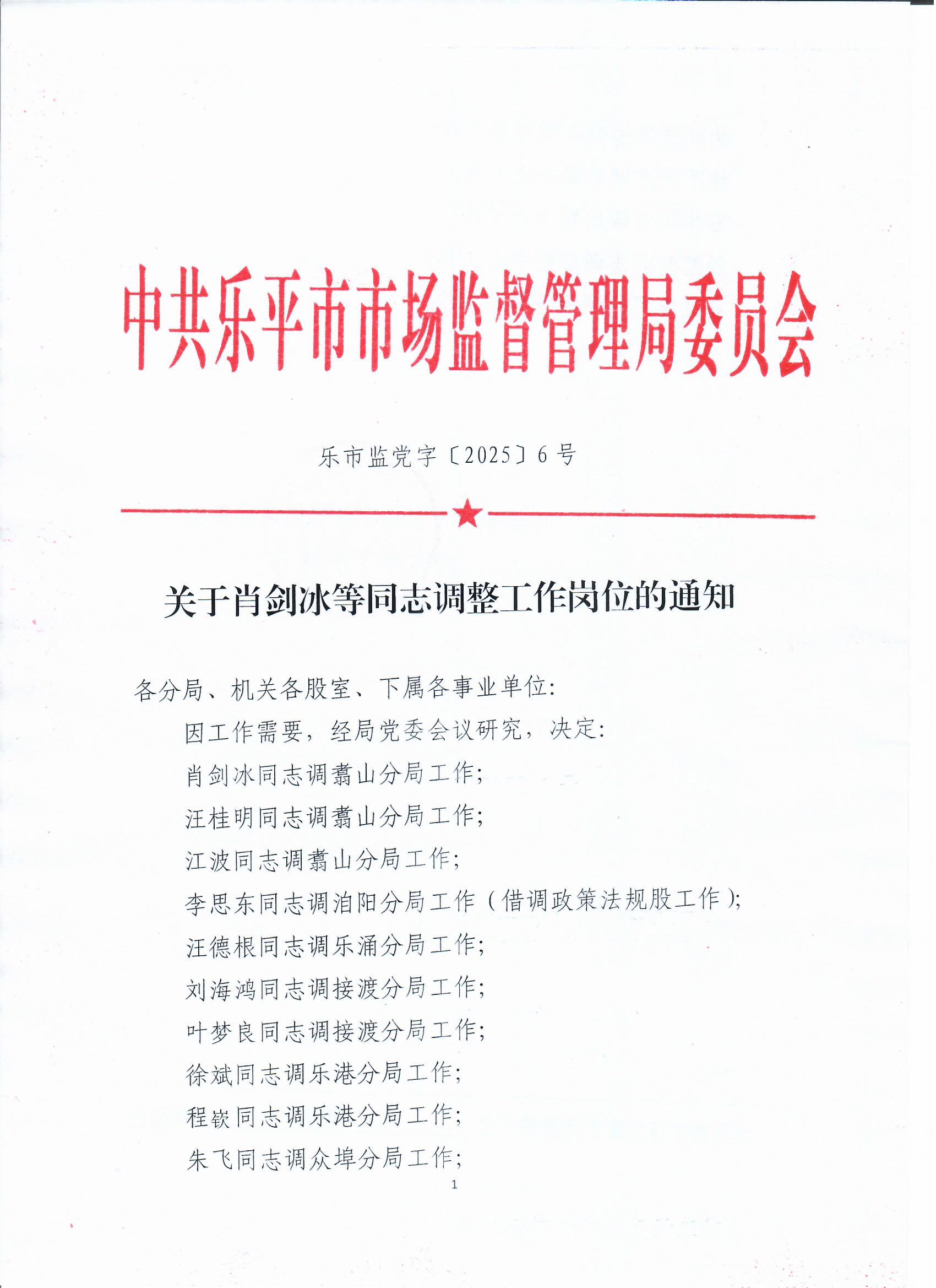 中共乐平市市场监督管理局委员会关于肖剑冰等同志调整工作岗位的通知