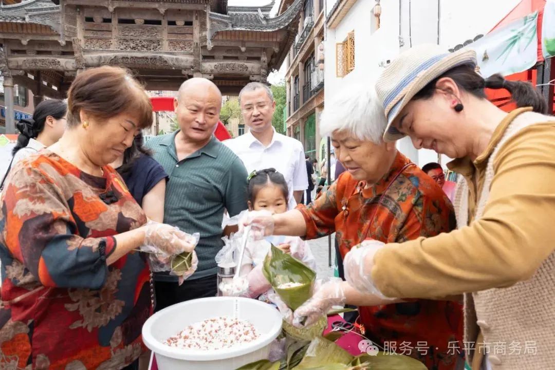 活动现场,“乐平特色小吃”展区香气四溢,周家巷萝卜饺、油条包麻糍、洄田炒粉等老字号摊位前排起长队,酥脆的油炸果、软糯的叶子饺等传统美味,让市民游客沉浸式感受地道乐平风味;特色农副食品展区内,桃酥的香甜、谷酒的醇厚、富硒大米的生态品质,全方位展示了乐平丰富的物产资源。在粽子主题区域,蒸煮区粽香弥漫,游客可免费品尝软糯甜香的粽子;DIY制作台前,主办方备好粽叶、糯米等食材,邀请游客亲手包粽子,体验传统习俗乐趣。