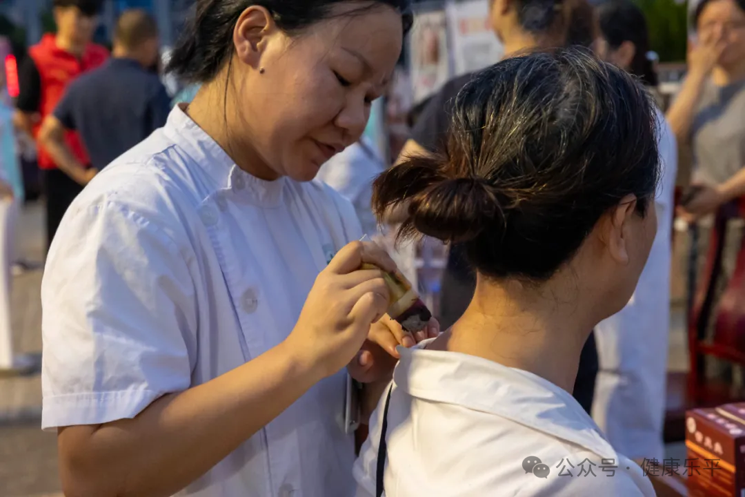7月25日晚,乐平市卫健委主办、乐平市中医医院医共体集团总院牵头的“传承中医药文化 共创健康新风尚”医疗健康志愿服务活动在市政广场开展,为市民送上暖心健康服务。