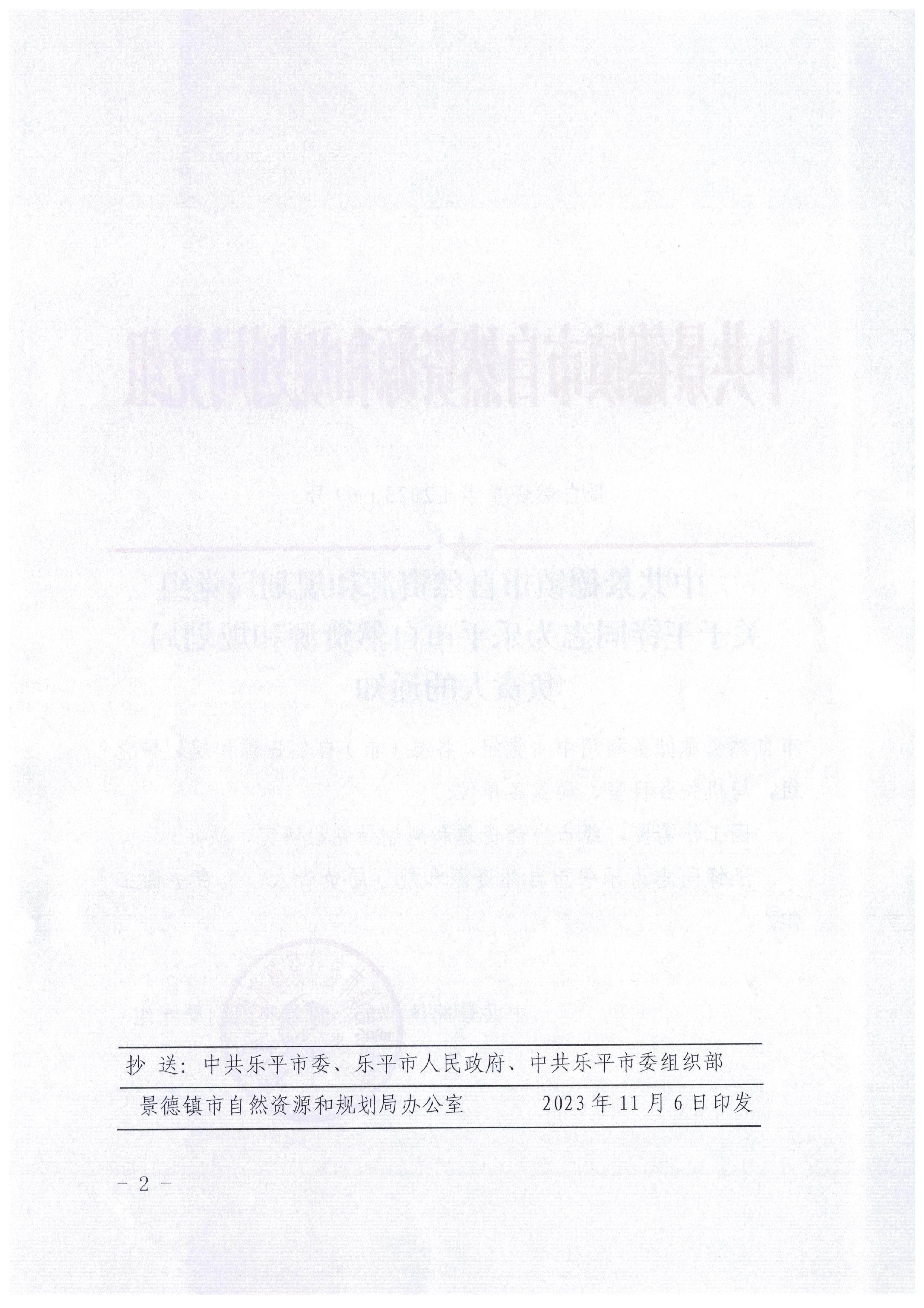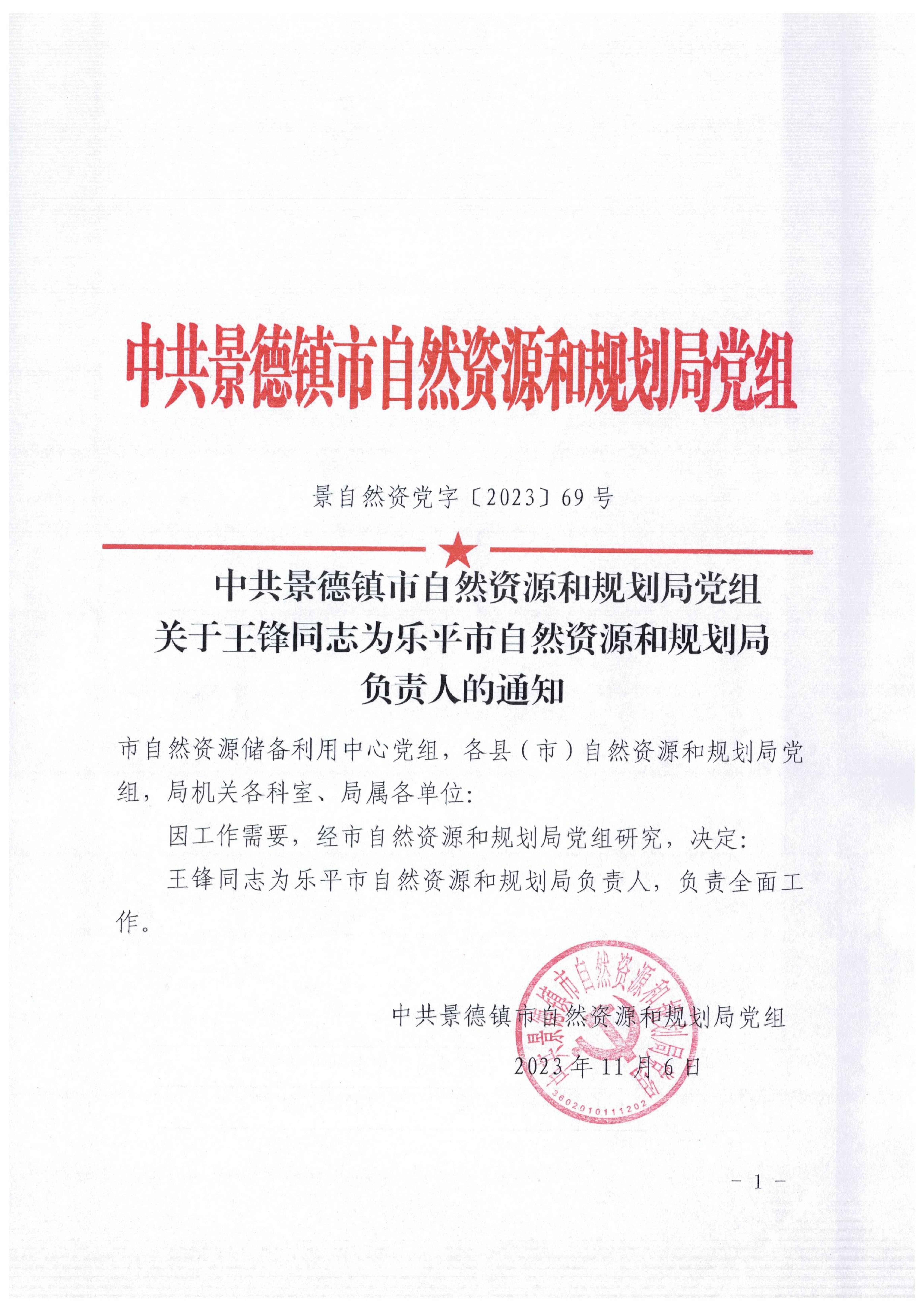中共景德镇市自然资源和规划局党组关于王锋同志为乐平市自然资源和规划局负责人的通知