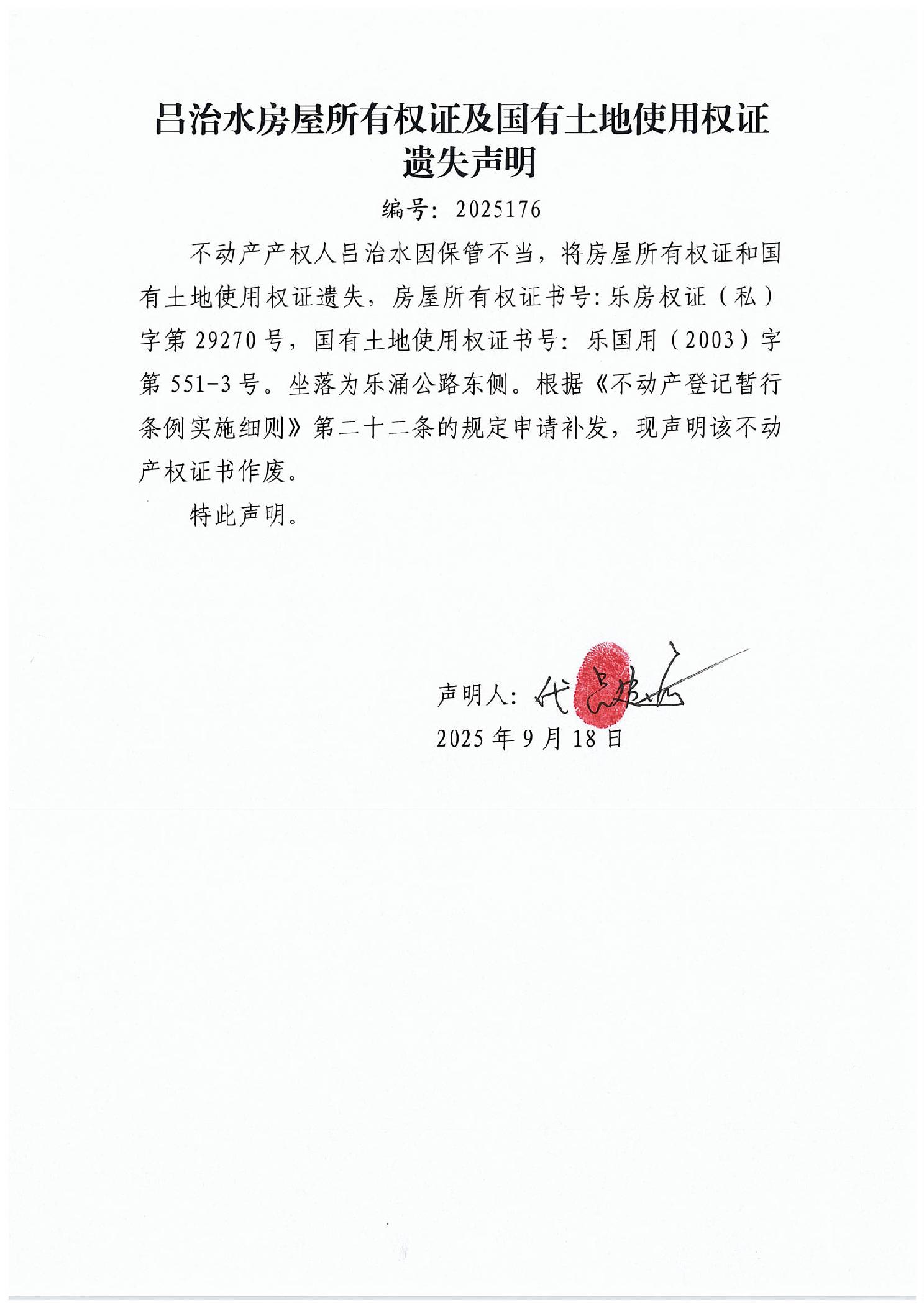 吕治水房屋所有权证及国有土地使用权证遗失声明