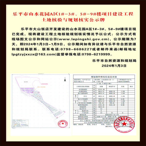 乐平市山水花园A区1#—3#、5#—9#楼项目建设工程土地核验与规划核实公示牌