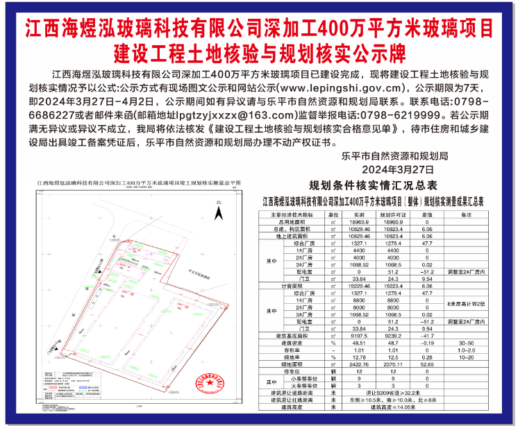 江西海煜泓玻璃科技有限公司深加工400万平方米玻璃项目建设工程土地核验与规划核实公示牌