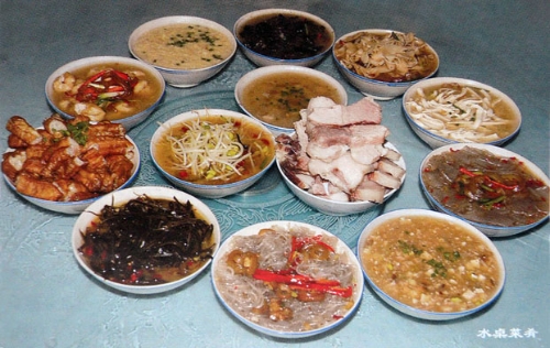 水桌酒,是别具一格的乐平酒宴,以每道菜均带汤水而得名。过去每逢红白喜事,均以水桌招待客人。先将办喜事的数十斤乃至上百斤猪肉切成若干长条状,放锅内用水煮。掌握好火候,及时把煮熟的肉捞出,无论肥瘦,均切成长约四寸、宽约二寸的肉块装碗,每桌8 块瘦肉在上,8 块肥肉在下,用小碟盛酱油蘸食。肉汁则用来煮豆腐、海带、粉丝、粉皮、油条、肉丸、猪肝等菜,一般每桌10 道汤菜左右,多则16道,因菜肴均用汤水制作的缘故,菜均不用盘装,一律用碗,故称为“水桌”酒。