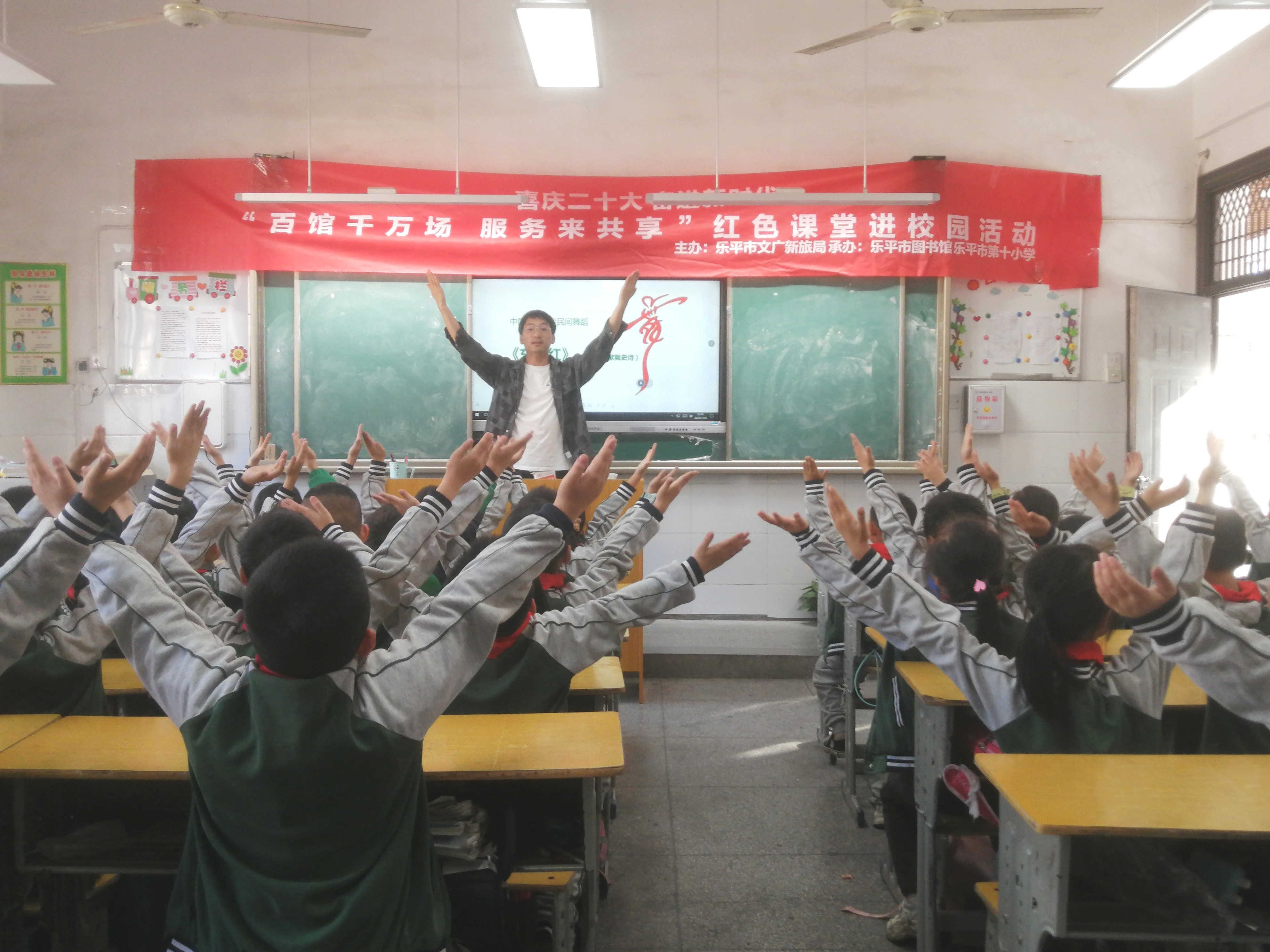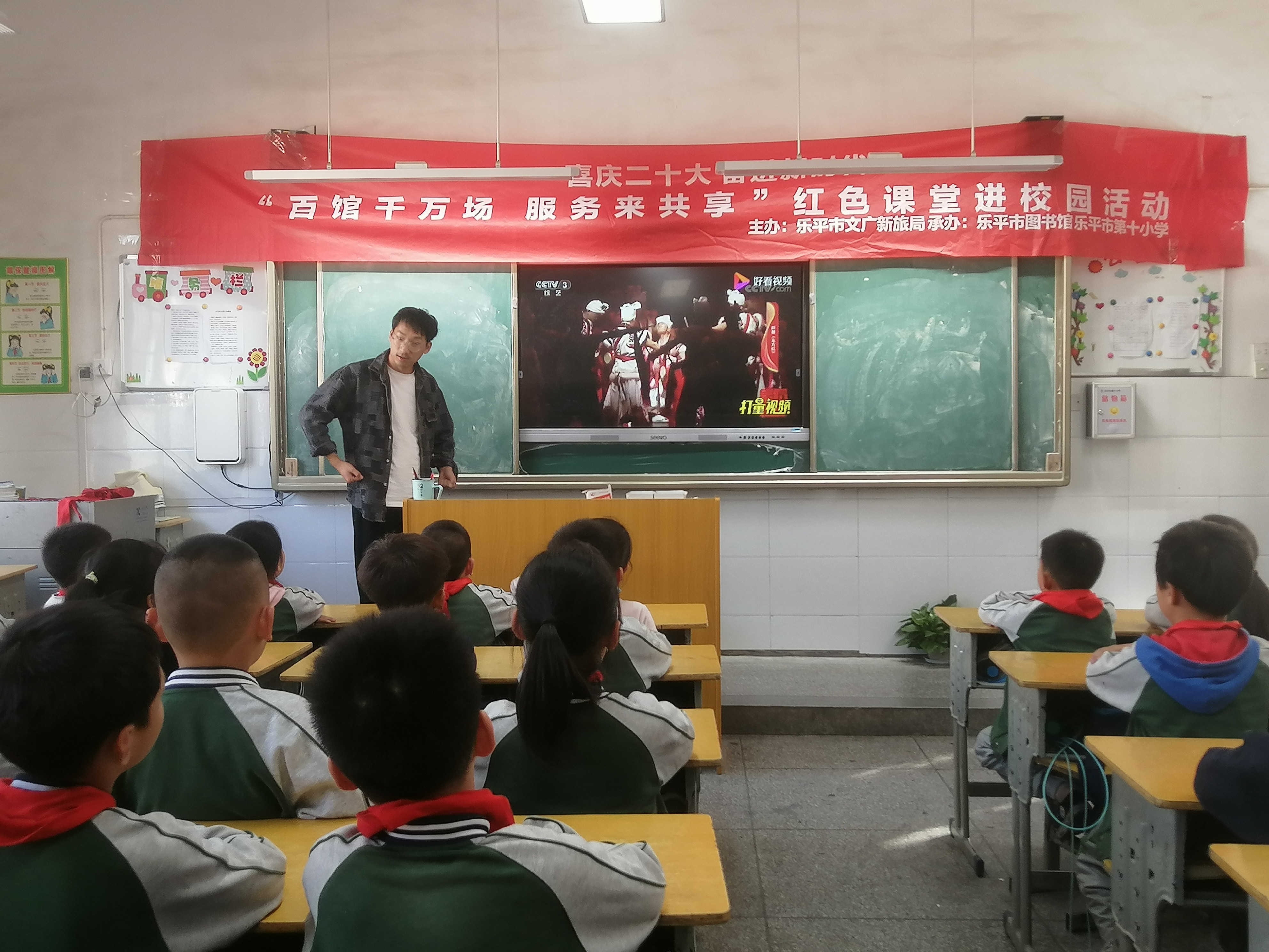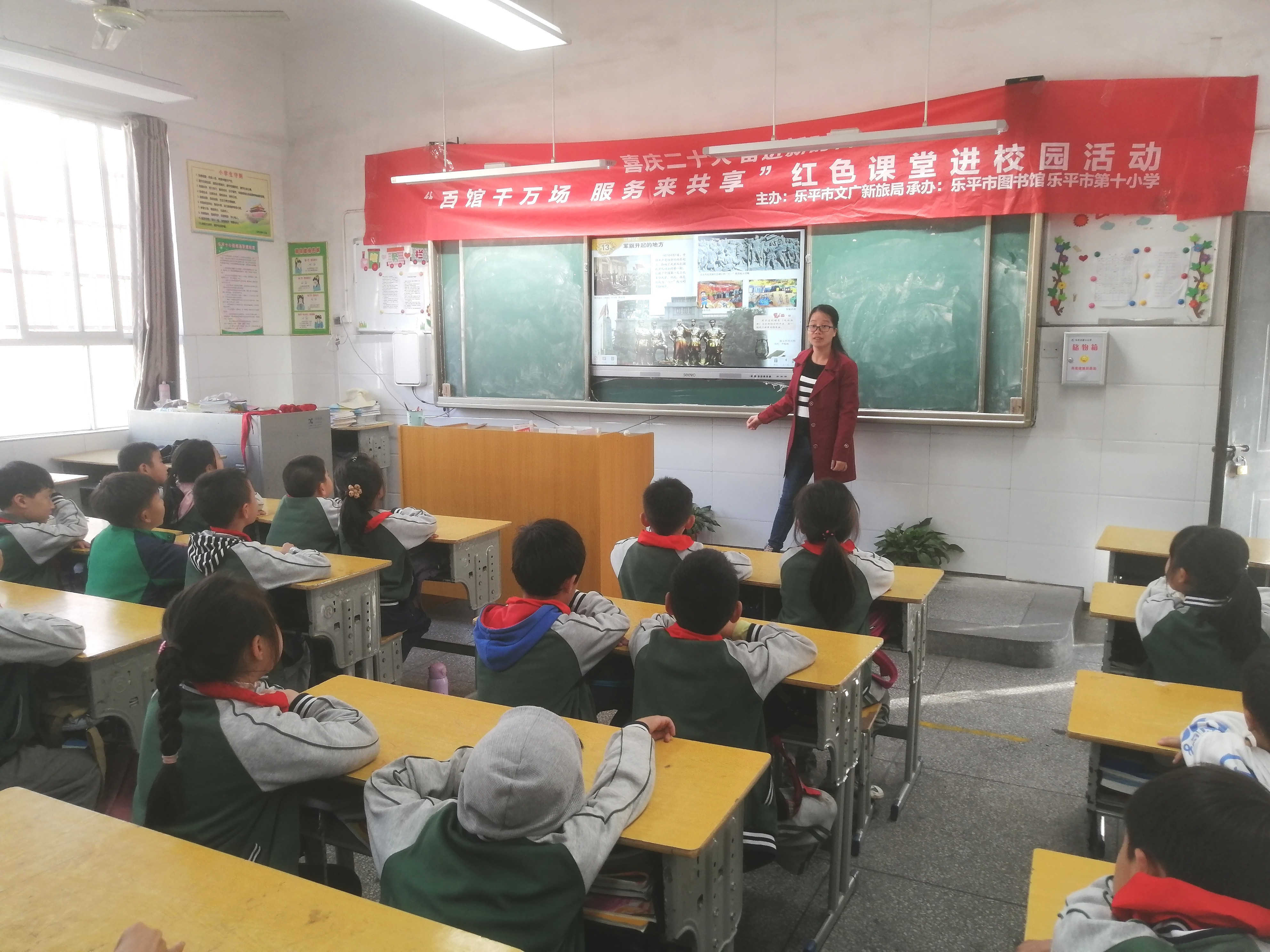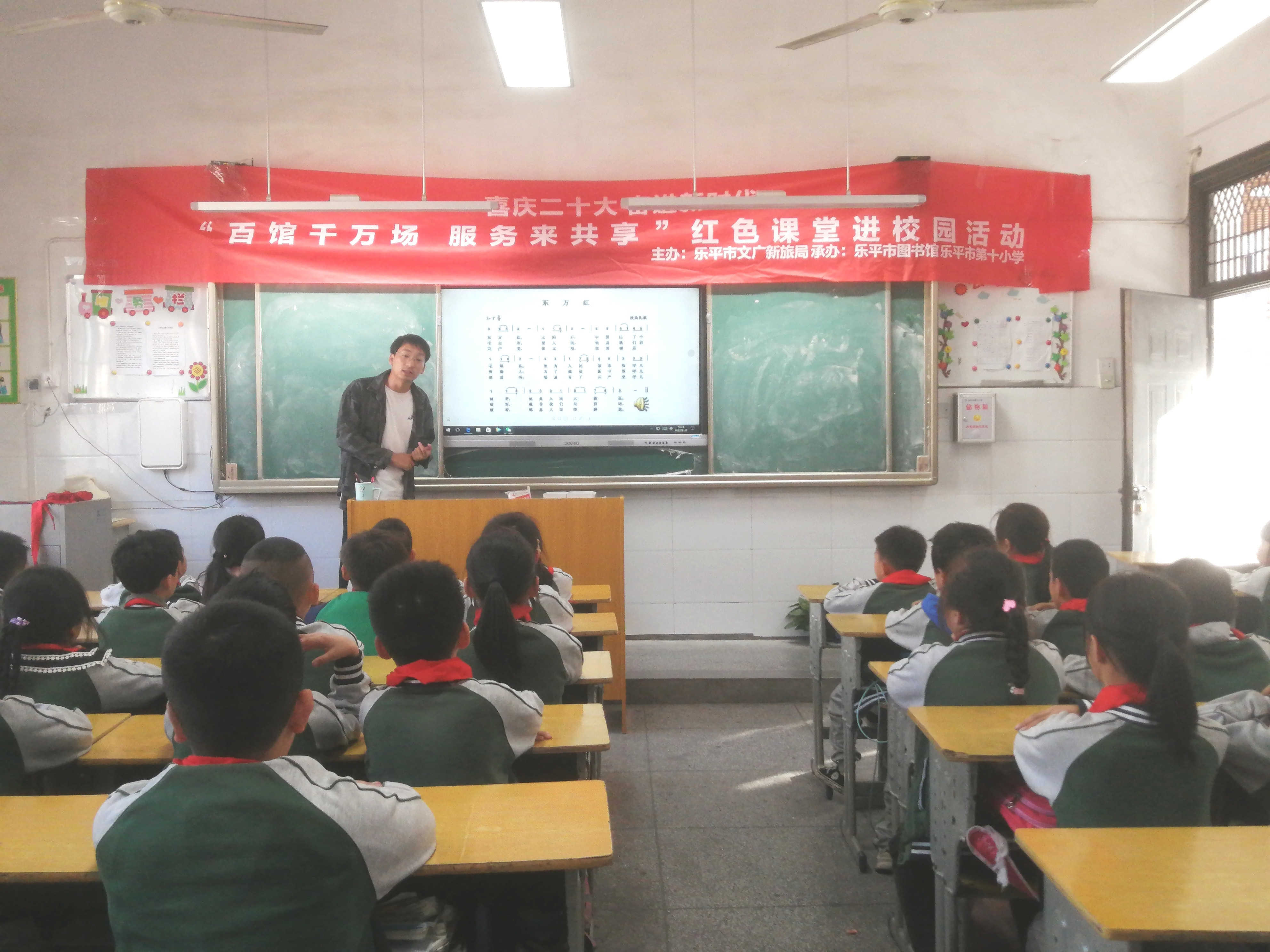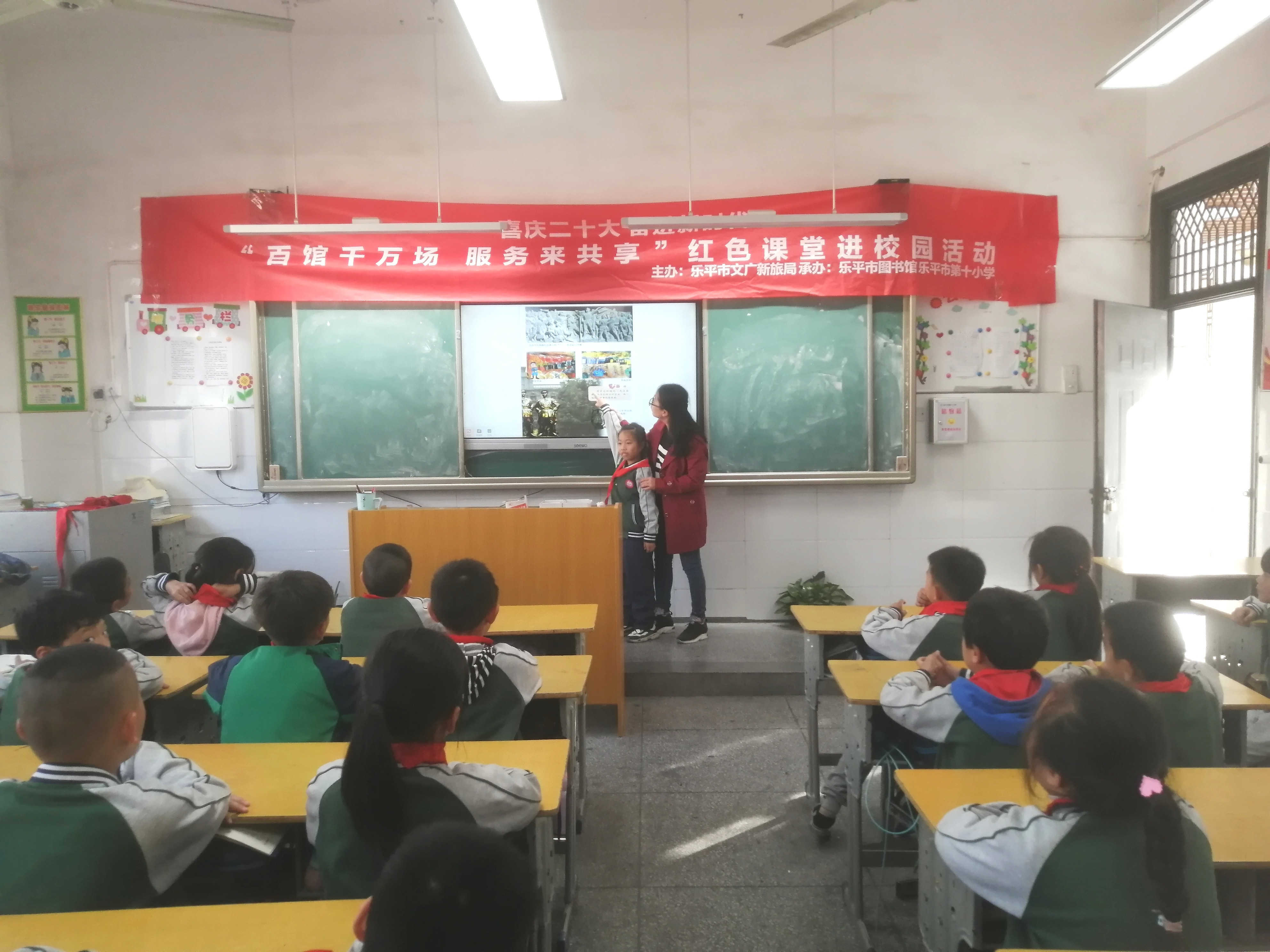 为宣讲党的二十大精神,传承红色基因,弘扬爱国精神,引导和激励中小学生学习红色文化,感悟红色力量,激发他们的爱国情怀。2022年11月3日,由乐平市文广新旅局主办,乐平市图书馆承办的 “百馆千万场 服务来共享”百馆百校红色课堂进校园活动,走进乐平市第十小学,学唱红色歌曲,讲述红色故事,带领小学生们回顾中国共产党的伟大革命历程。