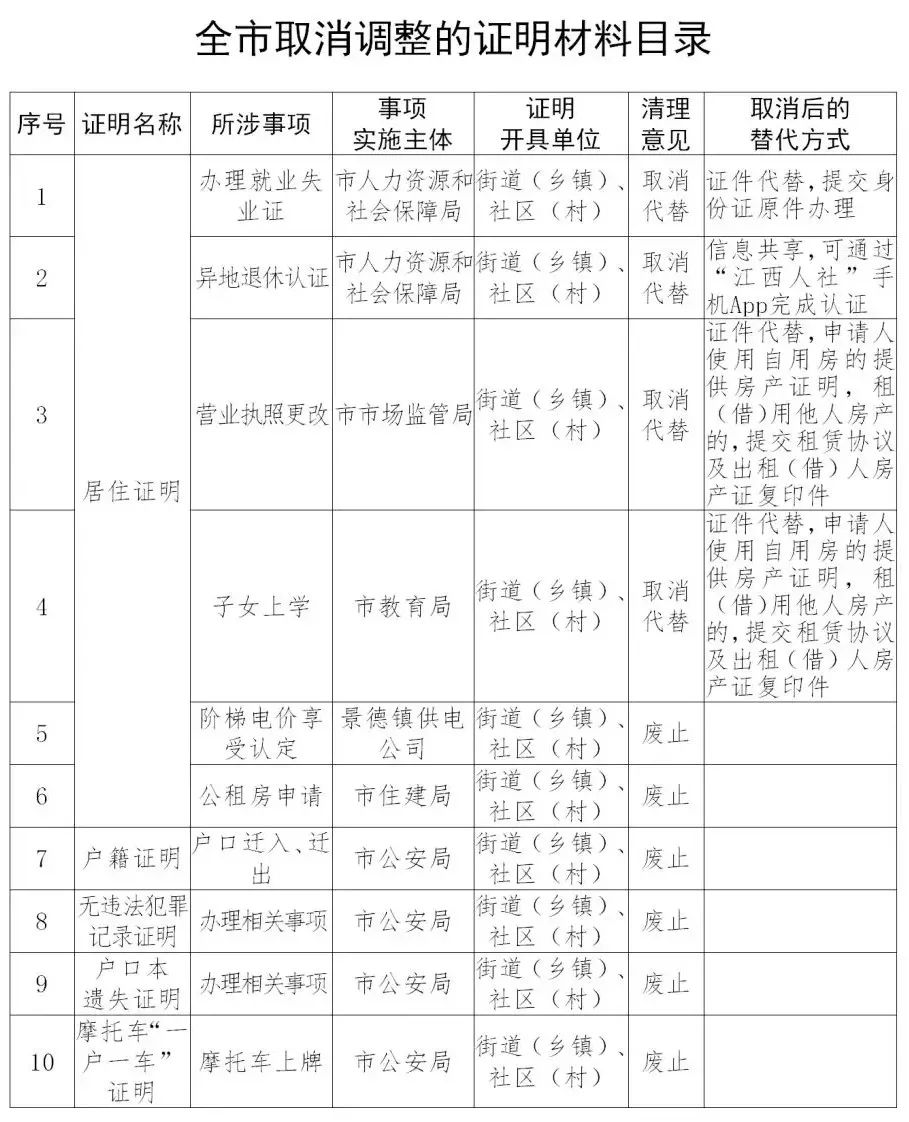 根据《江西省人民政府关于印发深入推进“放管服”改革全面优化政务服务若干措施的通知》(赣府字〔2019〕21号)要求,加快推动“只跑一次”改革,深入清理烦扰企业和群众的奇葩证明、循环证明、重复证明等各类无谓证明,大力减少盖章、审核、备案、确认、告知等繁琐环节和手续,着力减轻基层负担,切实方便企业群众办事,打通服务企业群众“最后一公里”,全市共梳理出需取消调整的由街道(乡镇)、社区(村)开具的20项证明材料,经市政府同意,现予以公布。