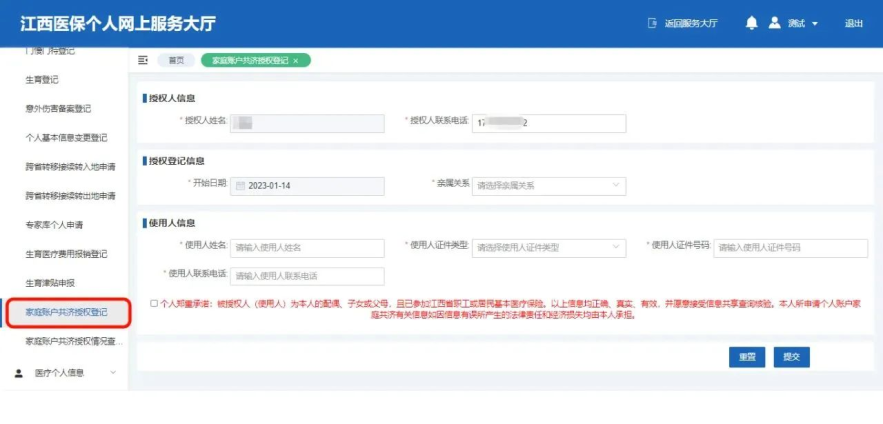 点击进入【家庭账户共济授权登记】,填写并提交家人(配偶、父母、子女)信息。登记完成后,不仅可以给家人代缴居民医保,家人在医院看病就医时,也可以使用你的个人账户余额支付医疗费用。