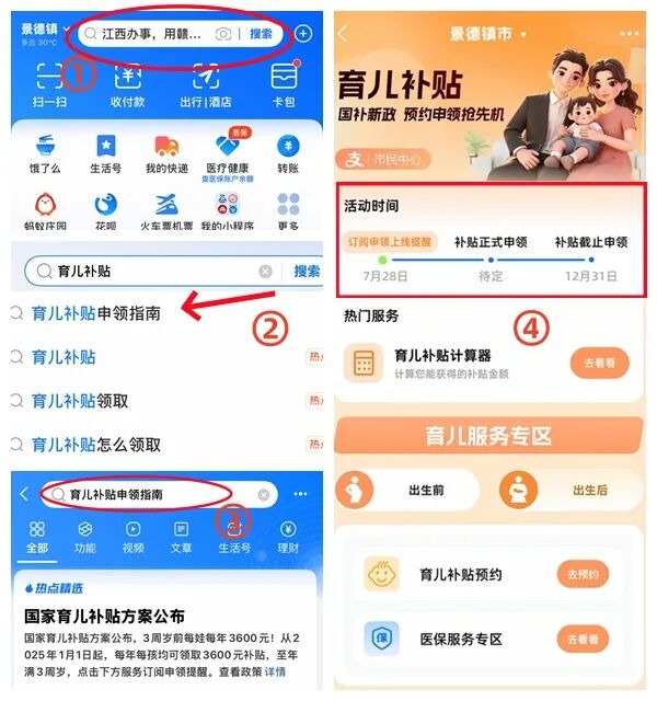 虽然乐平市具体的申领工作尚未正式启动,但市民可以通过便捷的线上方式提前了解相关信息。打开支付宝,在搜索页面搜索“育儿补贴申领指南”,即可详细了解补贴方案。同时,还能订阅申领上线提醒,以便在乐平市开放申领时第一时间知晓。此外,在此页面也能了解到各自育儿补贴的计算方式,提前做到心中有数。