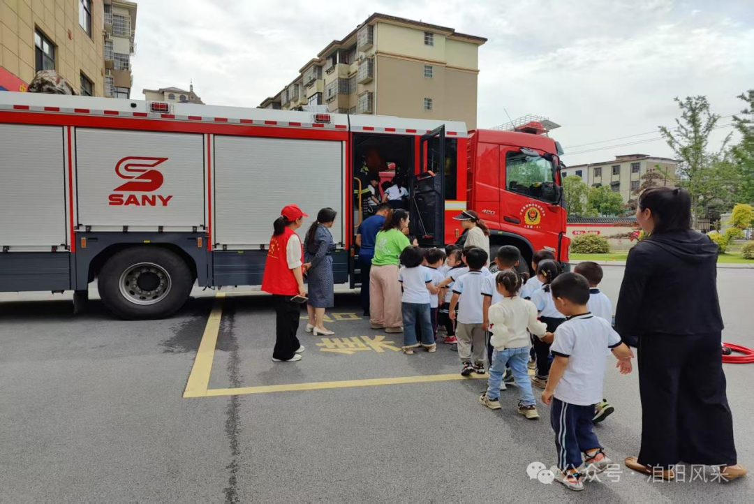 活动现场,一辆红色消防车成为孩子们的“超级课堂”。消防员用童趣语言讲解消防车“秘密武器”:云梯如何化身“高空救援手臂”、高压水枪如何喷出“银色巨龙”、警报灯闪烁时如何争分夺秒。孩子们围在消防车旁,或踮脚触摸水带,或模仿鸣笛声,兴奋地喊出“消防车好酷!”。