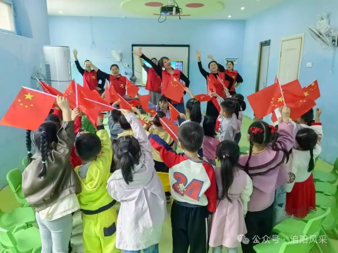 志愿者们还和小朋友们合唱一首《歌唱祖国》,歌中展现每一个中华儿女对祖国母亲的依赖与赞美。结尾处,“我们团结友爱坚强如钢”反复迭起,全体小朋友和志愿者们共同挥舞小国旗,将全场气氛推向高潮。