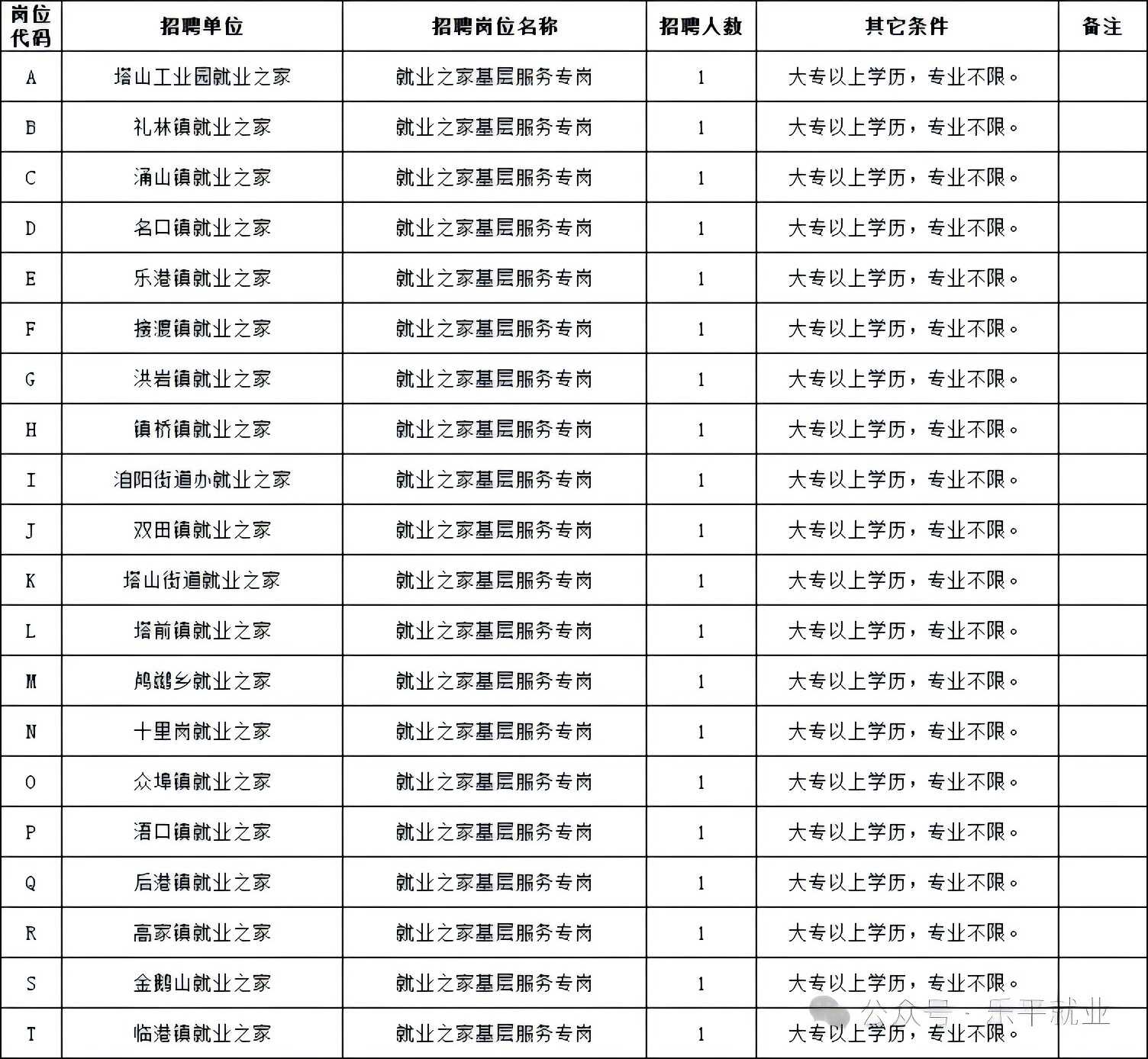公开招聘20名就业之家基层服务专岗人员(以下简称专岗对象),安排在各乡镇就业之家面向农村基层群众,从事就业之家平台运营、岗位收集、发布、劳动力数据汇总等相关服务工作(具体岗位见附件1)。