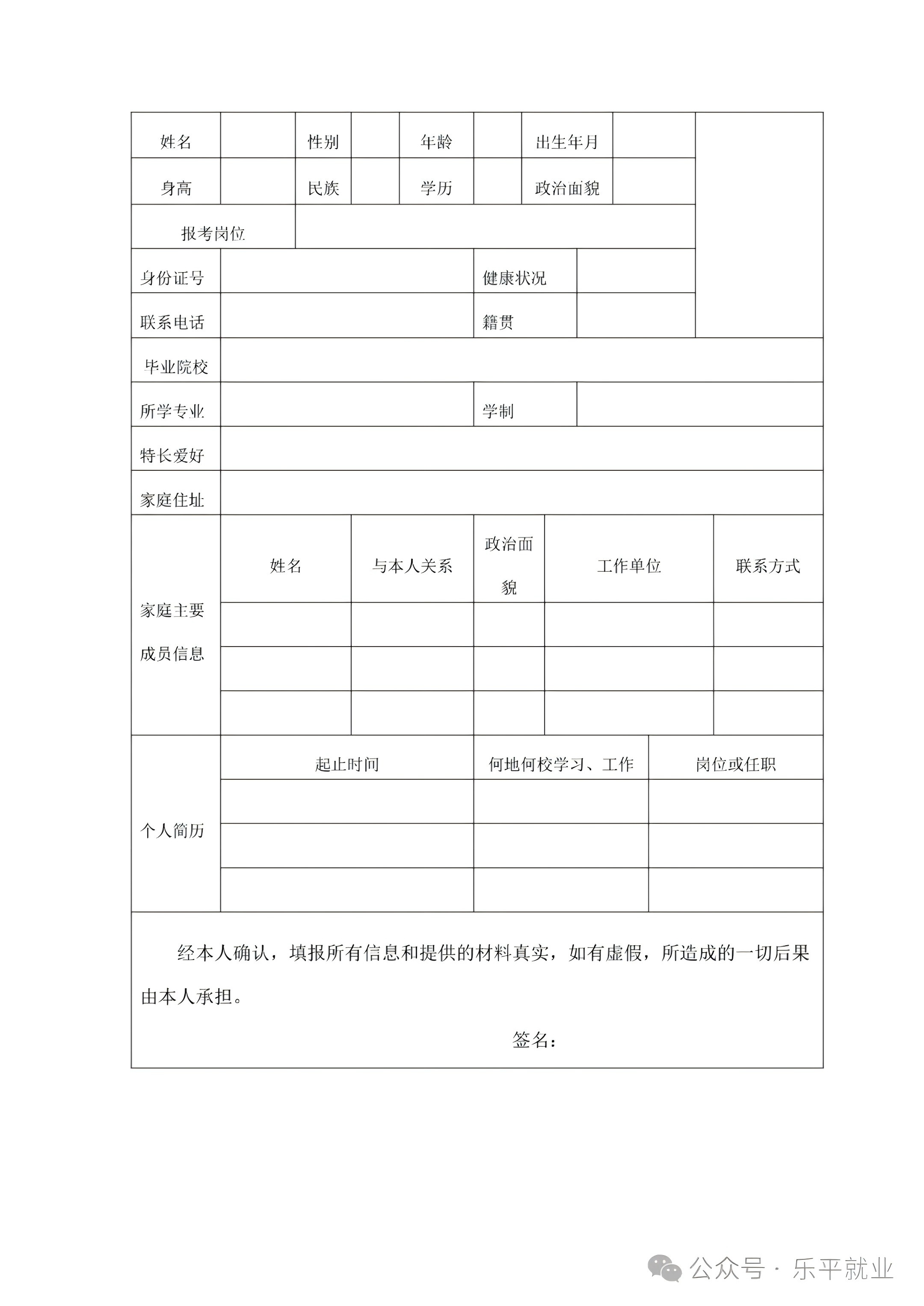 乐平市2024年就业之家基层服务专岗人员报名表
