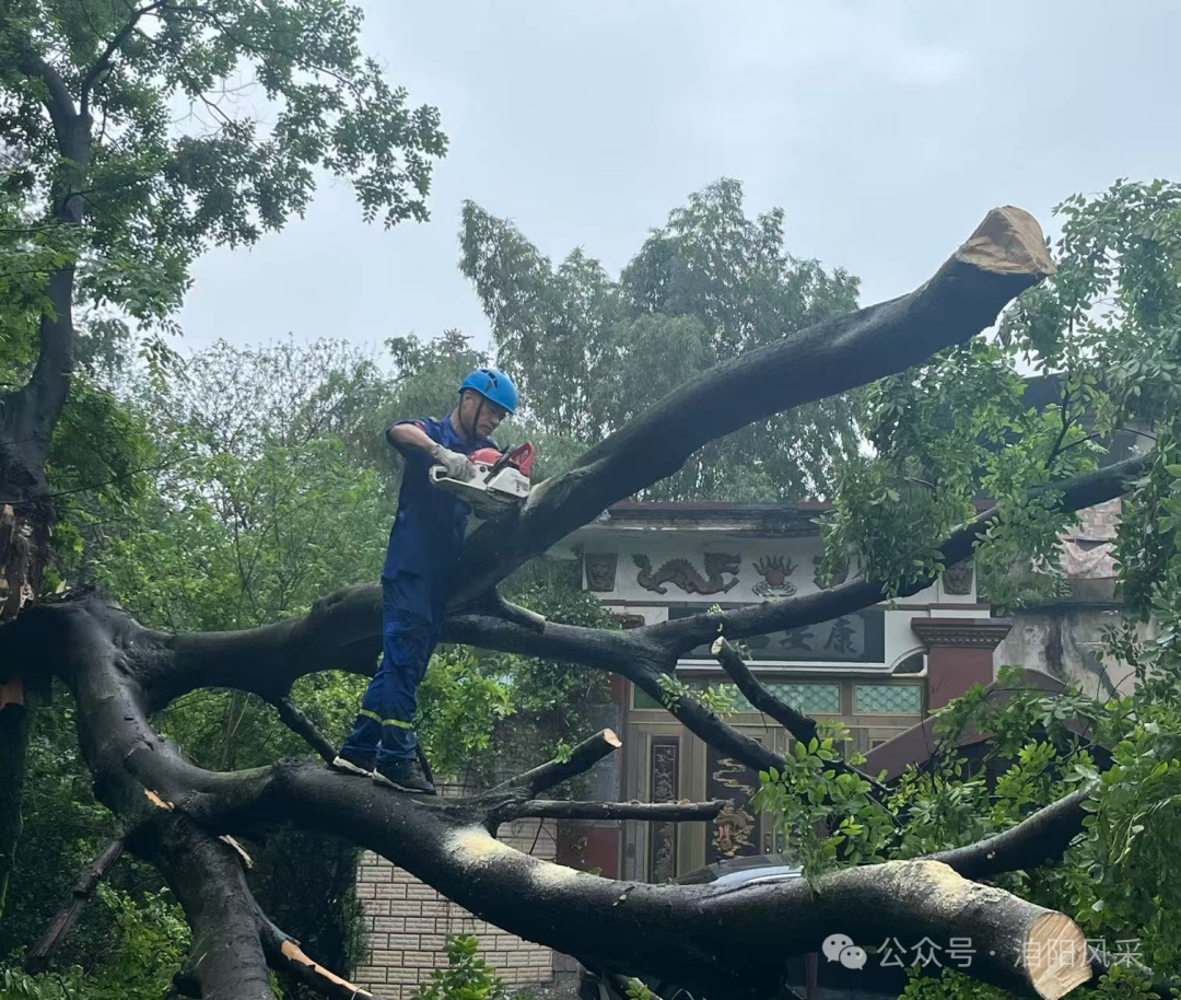 在清理现场,大家分工明确,蓝天救援队队员手持电锯,眼神专注而坚定,熟练地操作着工具,随着电锯“嗡嗡”作响,粗壮的树干被一点点锯断,木屑在空气中飞扬;社区工作人员则合力抬起锯下的树干,喊着整齐有力的号子“一、二、三,起!”,将沉重的树干搬运到一旁安全的地方,他们的脸上满是汗水,却丝毫没有懈怠;志愿者也加入队伍,拿着扫帚,认真清扫着散落在路面上的枯枝残叶,不放过任何一个角落,确保路面整洁畅通。