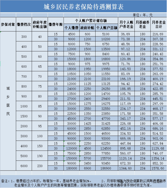 城乡居民基本养老保险月养老金由基础养老金和个人账户养老金两部分组成。目前乐平市基础养老金最低标准为每人每月180元,个人账户养老金为个人账户储存额本息除以139。在满足最低缴费年限15年的基础上,每增加一年缴费,基础养老金增加2%。因此,个人选择的缴费档次越高、缴费年限越长,其个人缴费、政府补贴的本息就越多,年满60周岁后领取的养老金就越多。