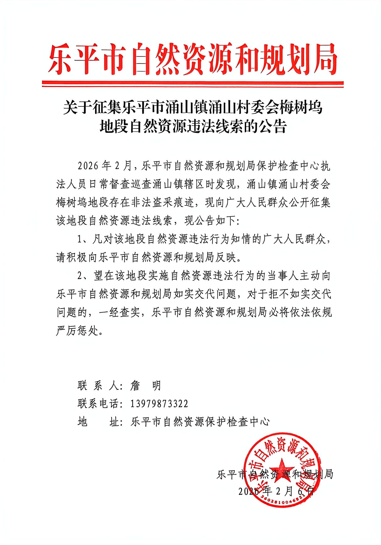 关于征集乐平市涌山镇涌山村委会梅树坞地段自然资源违法线索的公告