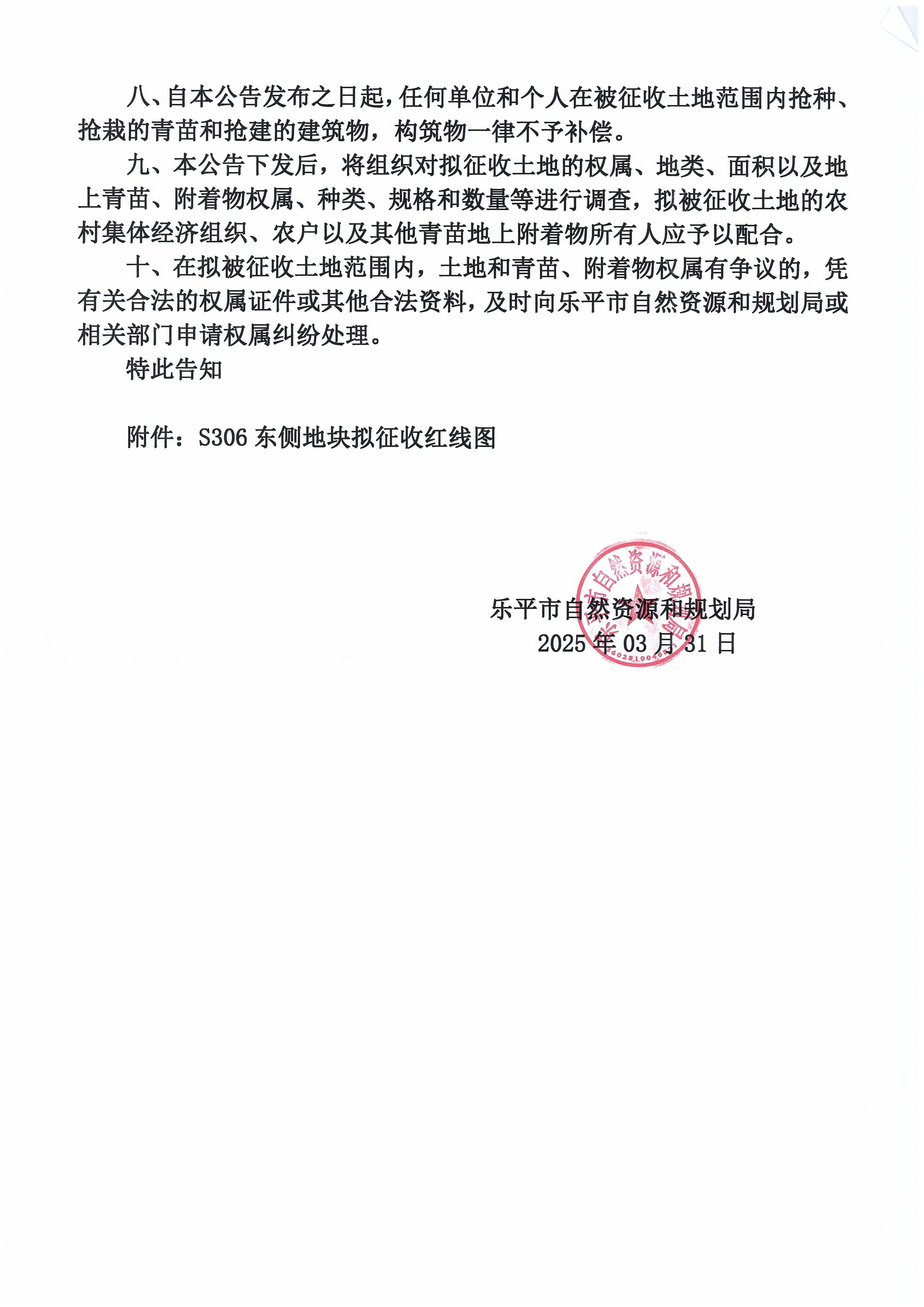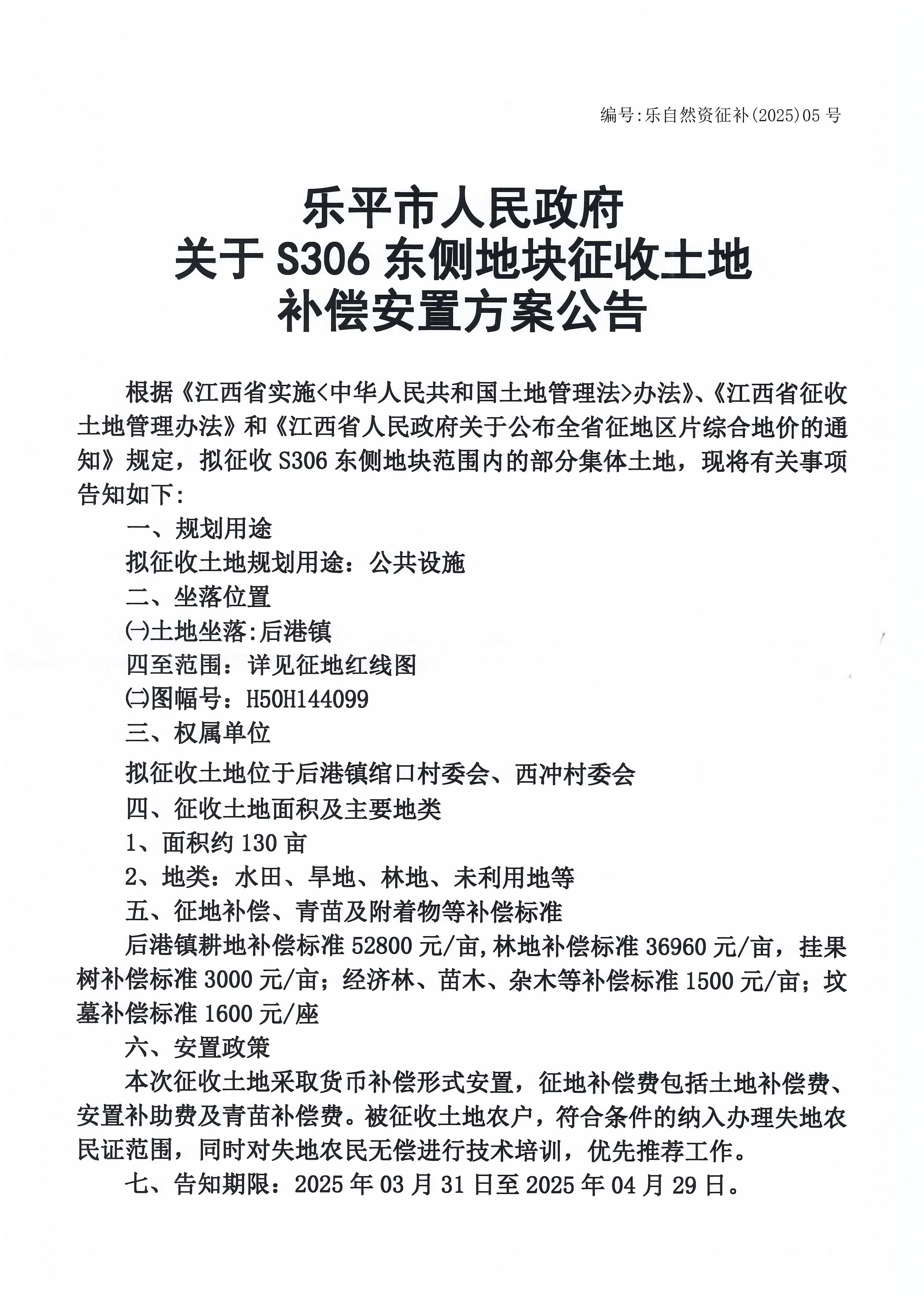 乐平市人民政府关于S306东侧地块征收土地补偿安置方案公告