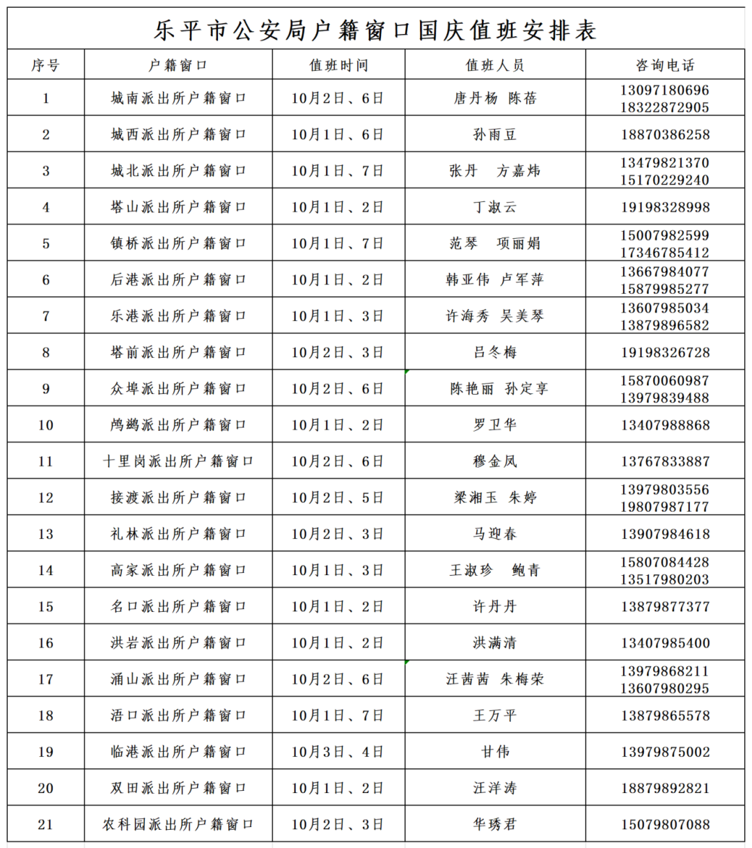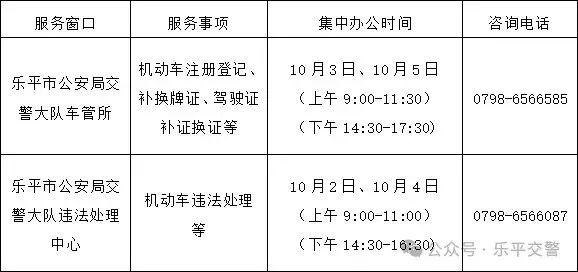 别担心!为方便外出务工、经商、求学返乡群众办证办事,确保错时延时服务不间断。乐平市公安局各派出所户籍窗口、乐平市城区交管窗口将错时为您服务,国庆假期“不打烊”。