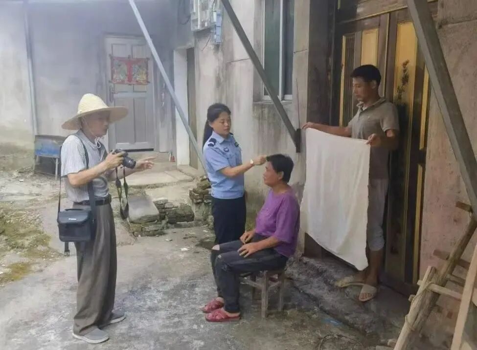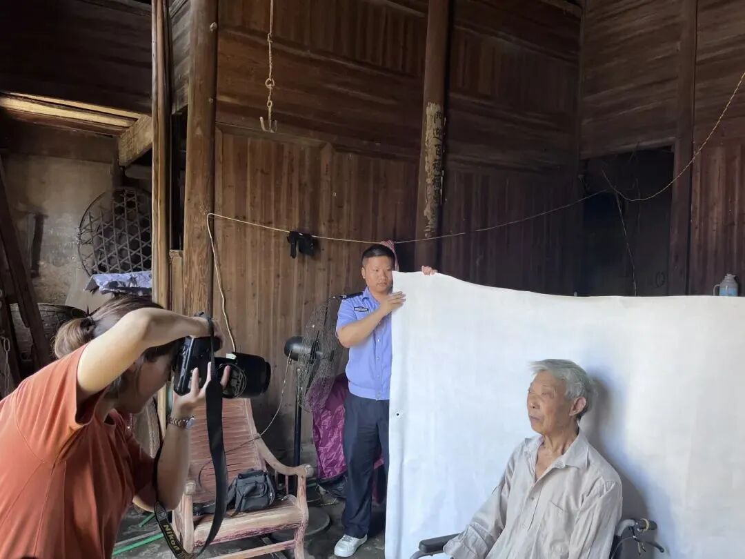 今年6月,双田派出所民警接到辖区群众徐先生求助,称其父亲年事已高,身份证不慎遗失,无法办理医保,且患有疾病无法行走,不知如何是好。考虑到老人特殊情况,该所户籍民警带领辅警、照相馆工作人员携带办理身份证所需的采集器材、照相机、背景布等办证设备前往徐先生家。
