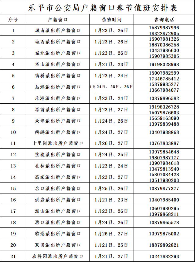 春节假期将至,为方便乐平市民户政业务办理,乐平市公安局各派出所将安排值班人员集中办理户政业务,具体值班情况如下表: