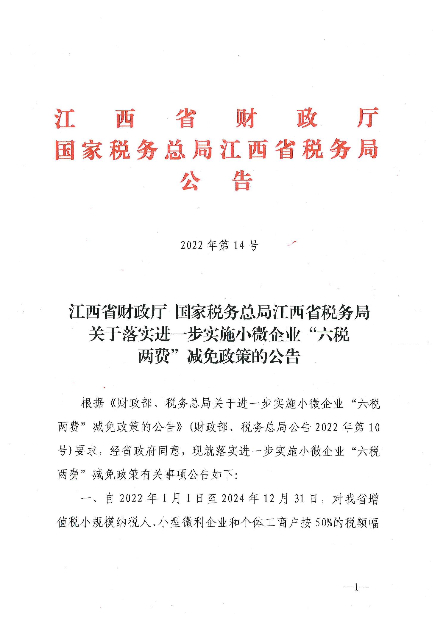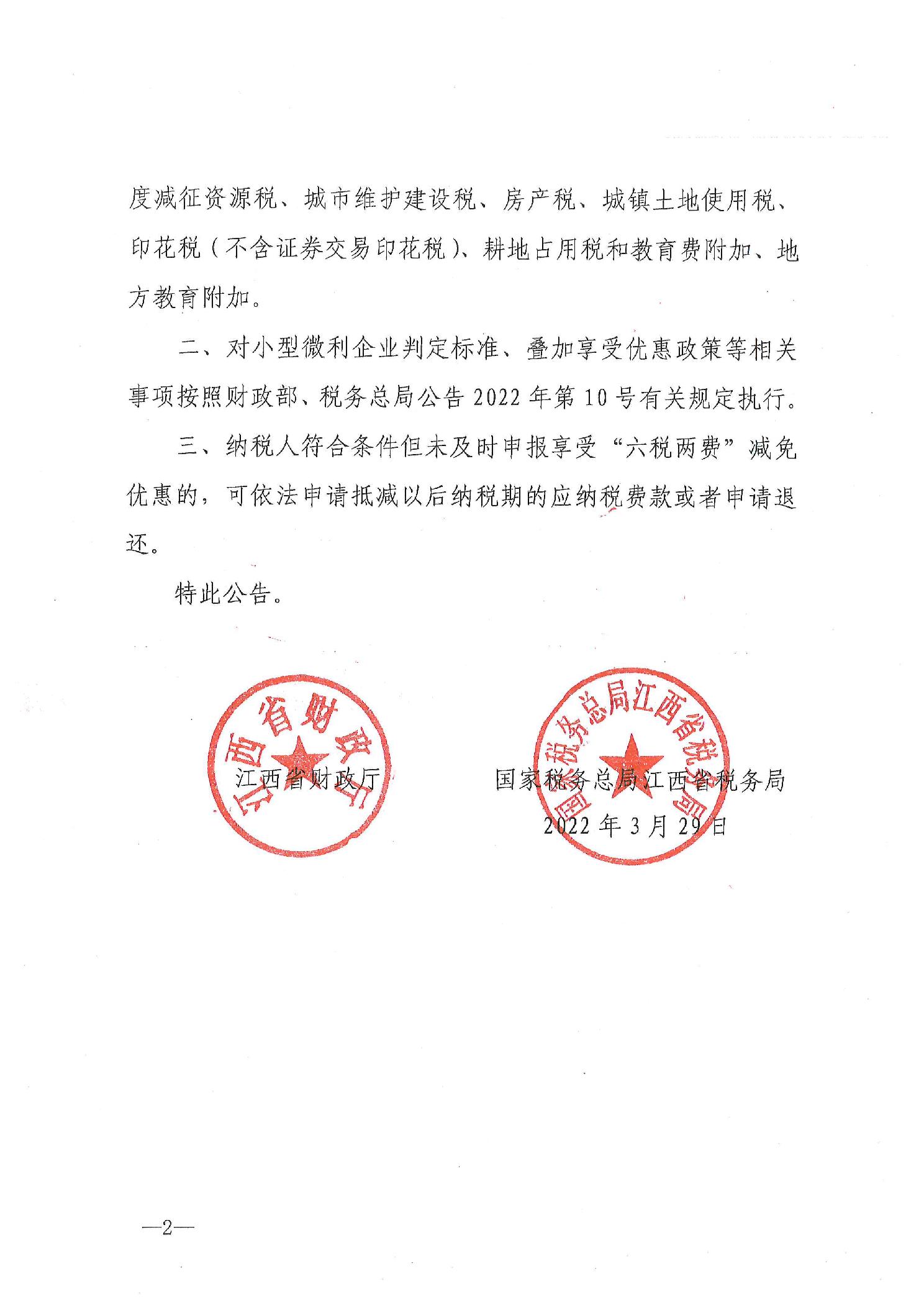 江西省财政厅 国家税务总局江西省税务局关于落实进一步实施小微企业“六税两费”减免政策的公告