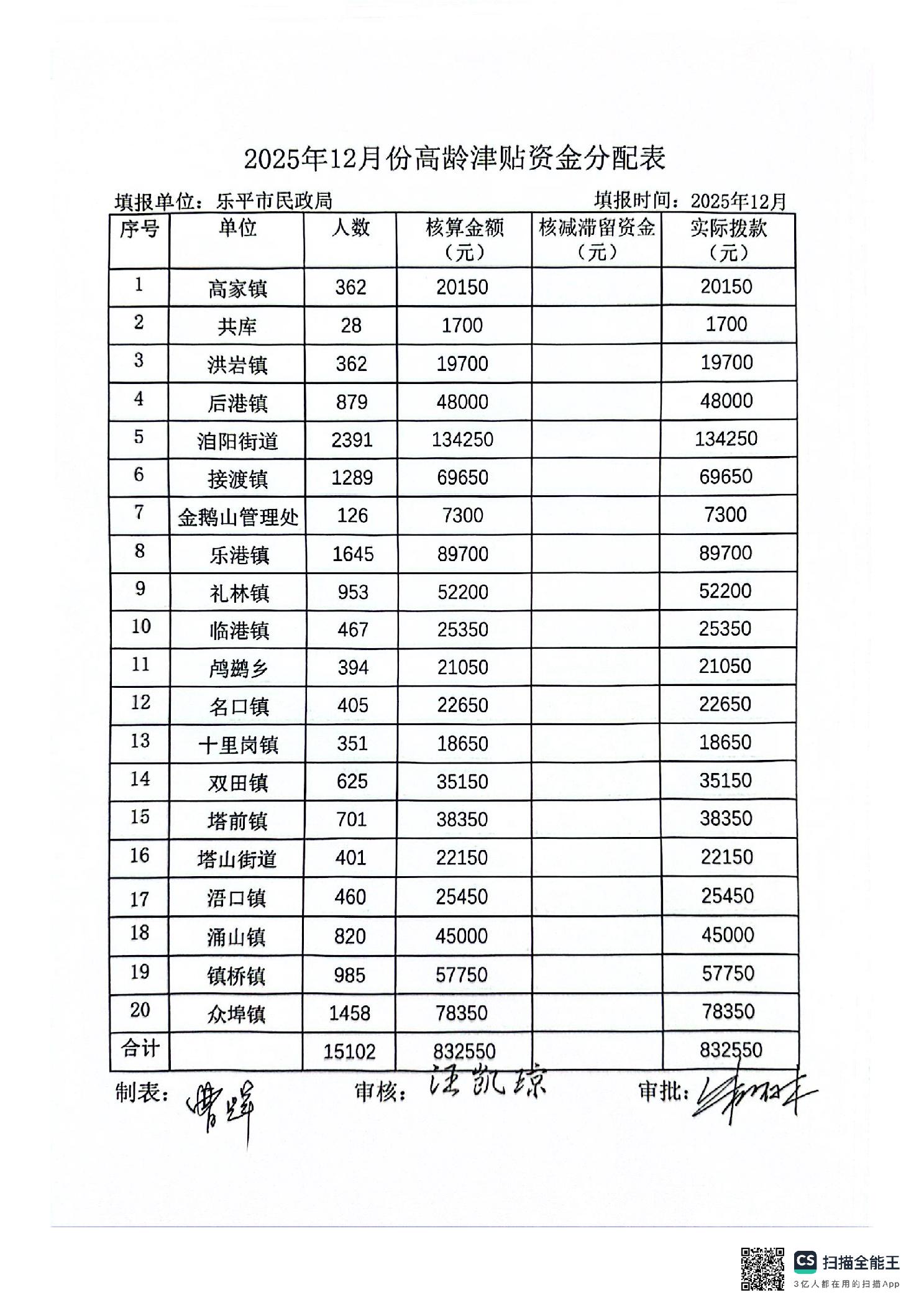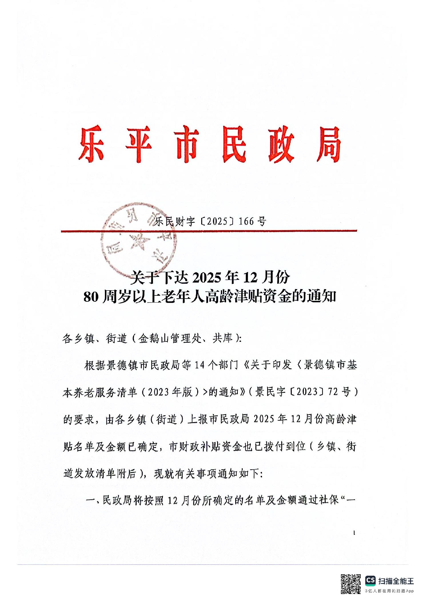 乐平市民政局2025年12月份高龄津贴资金发放表