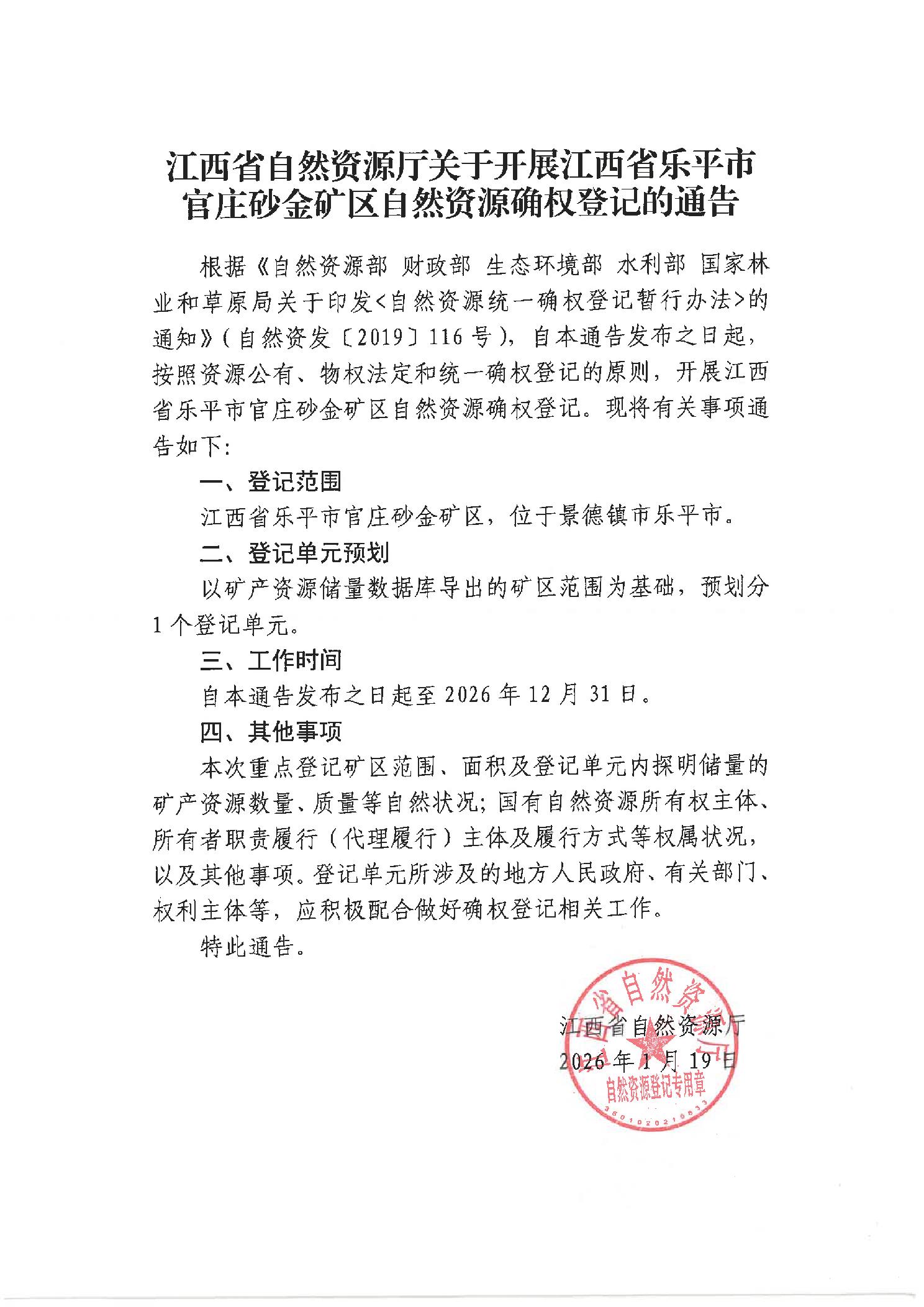 江西省自然资源厅关于开展江西省乐平市官庄砂金矿区自然资源确权登记的通告