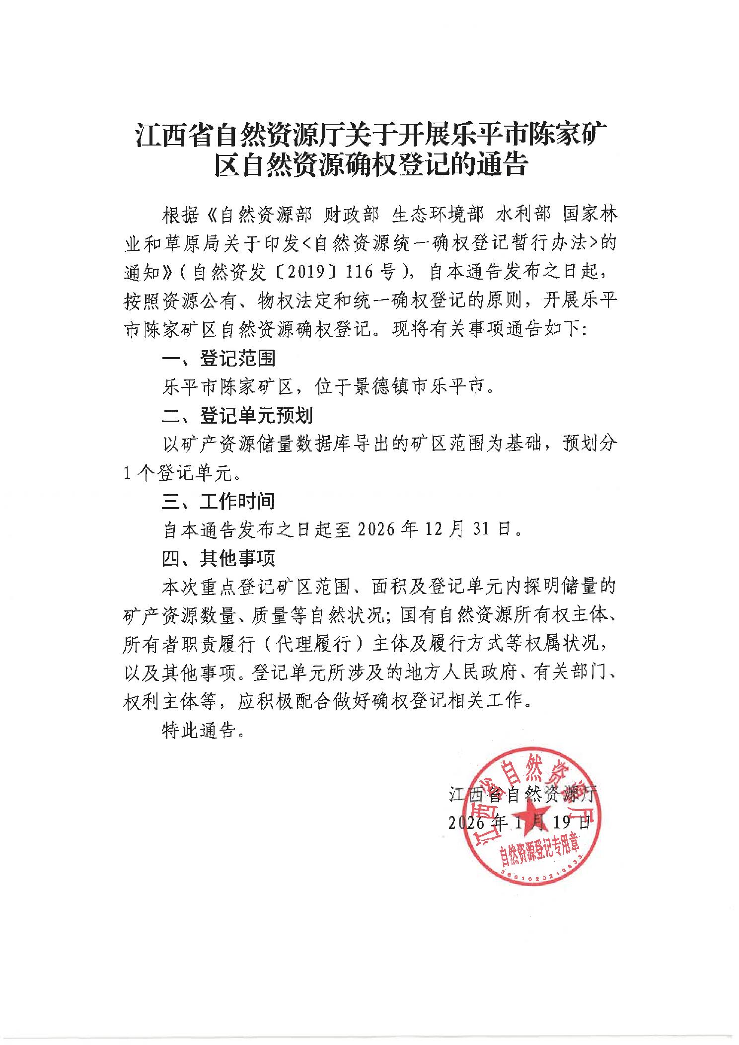江西省自然资源厅关于开展乐平市陈家矿区自然资源确权登记的通告