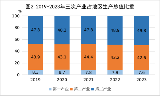 初步核算,全年地区生产总值[2]32200.1亿元,比上年增长4.1%。其中, 第一产业增加值2450.4亿元,增长4.0%;第二产业增加值13706.5亿元,增长4.6%;第三产业增加值16043.2亿元,增长3.6%。三次产业结构为7.6:42.6:49.8,三次产业对GDP增长的贡献率分别为8.1%、48.7%和43.1%。人均地区生产总值71216元,增长4.1%。