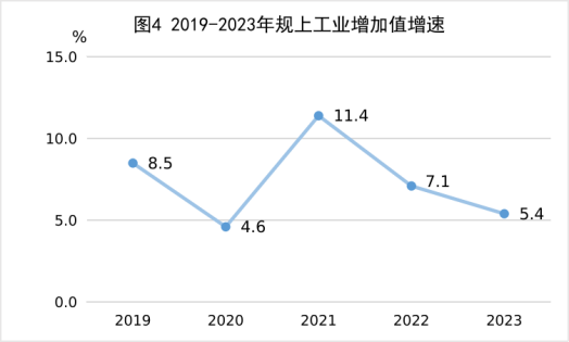 全年全部工业增加值11180.7亿元,比上年增长5.3%。规模以上工业增加值增长5.4%。在规模以上工业中,分经济类型看,国有企业增长9.6%,股份制企业增长6.0%,外商及港澳台商投资企业下降0.1%;分门类看,采矿业下降5.0%,制造业增长6.1%,电力、热力、燃气及水生产和供应业增长0.4%。