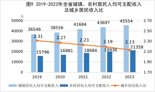 全年居民人均可支配收入34242元,比上年增长5.6%。按常住地分,城镇居民人均可支配收入45554元,增长4.2%;农村居民人均可支配收入21358元,增长7.1%。城乡居民人均可支配收入比值为2.13,比上年缩小0.06。