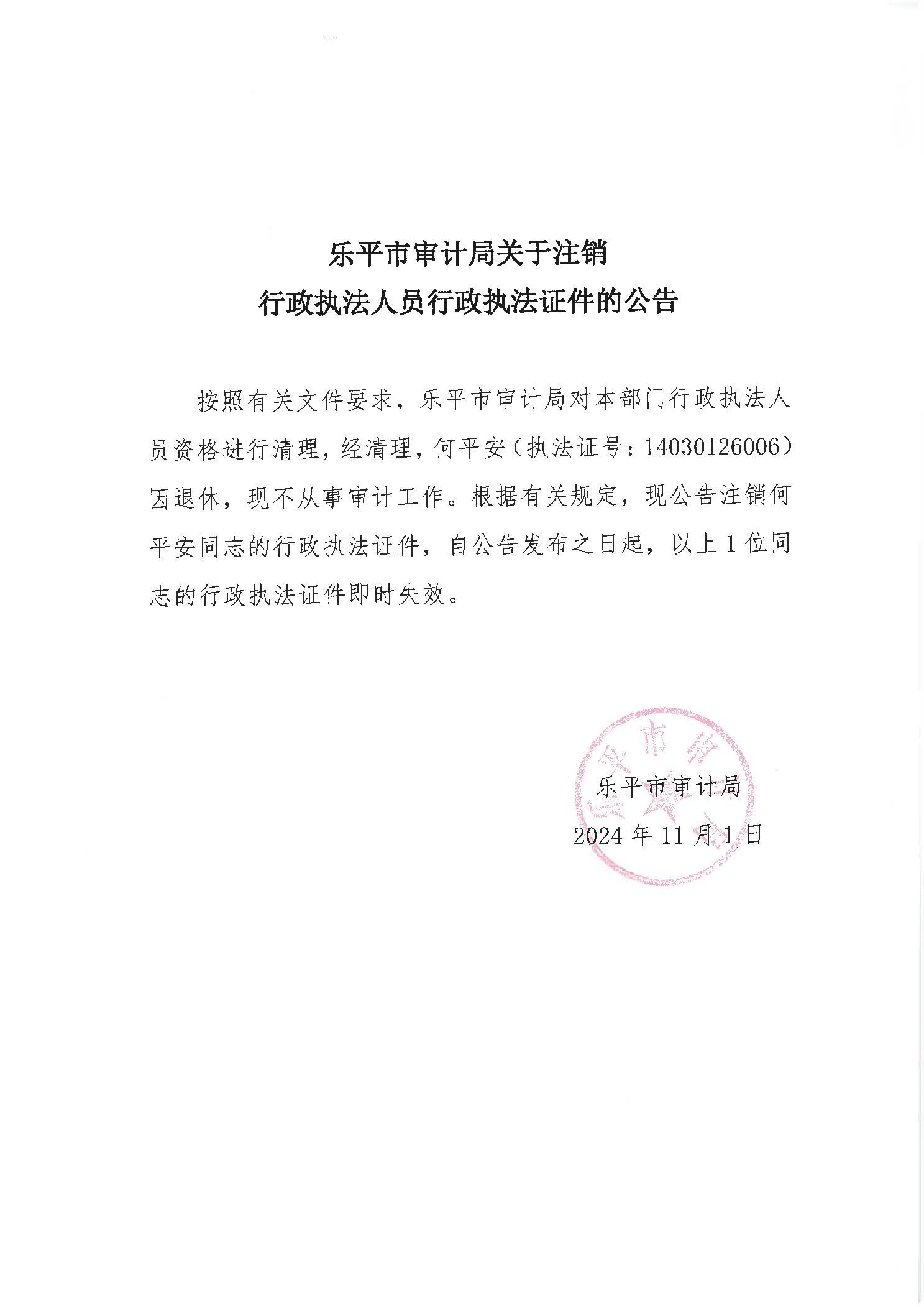 乐平市审计局关于注销行政执法人员行政执法证件的公告