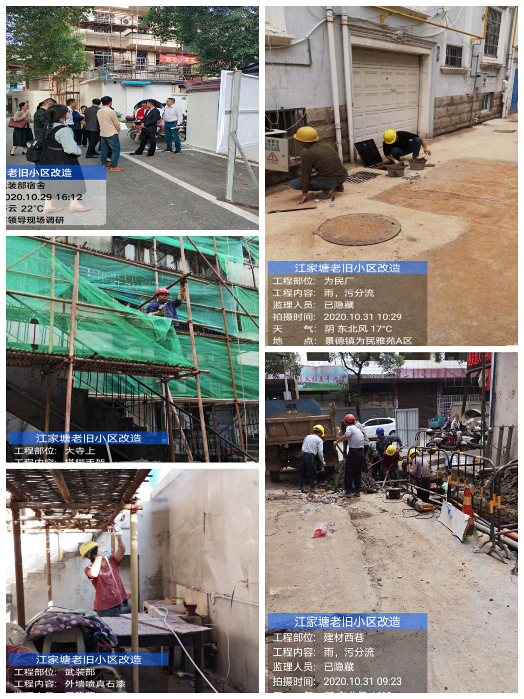 1.武装部宿舍:屋面清理垃圾、外立面施工;2、为民厂:雨、污管道分流改造;3、建材西巷:雨、污管道分流改造;4、商业局宿舍:雨、污水分流改造施工;5、大寺上:外立面脚手架搭设。