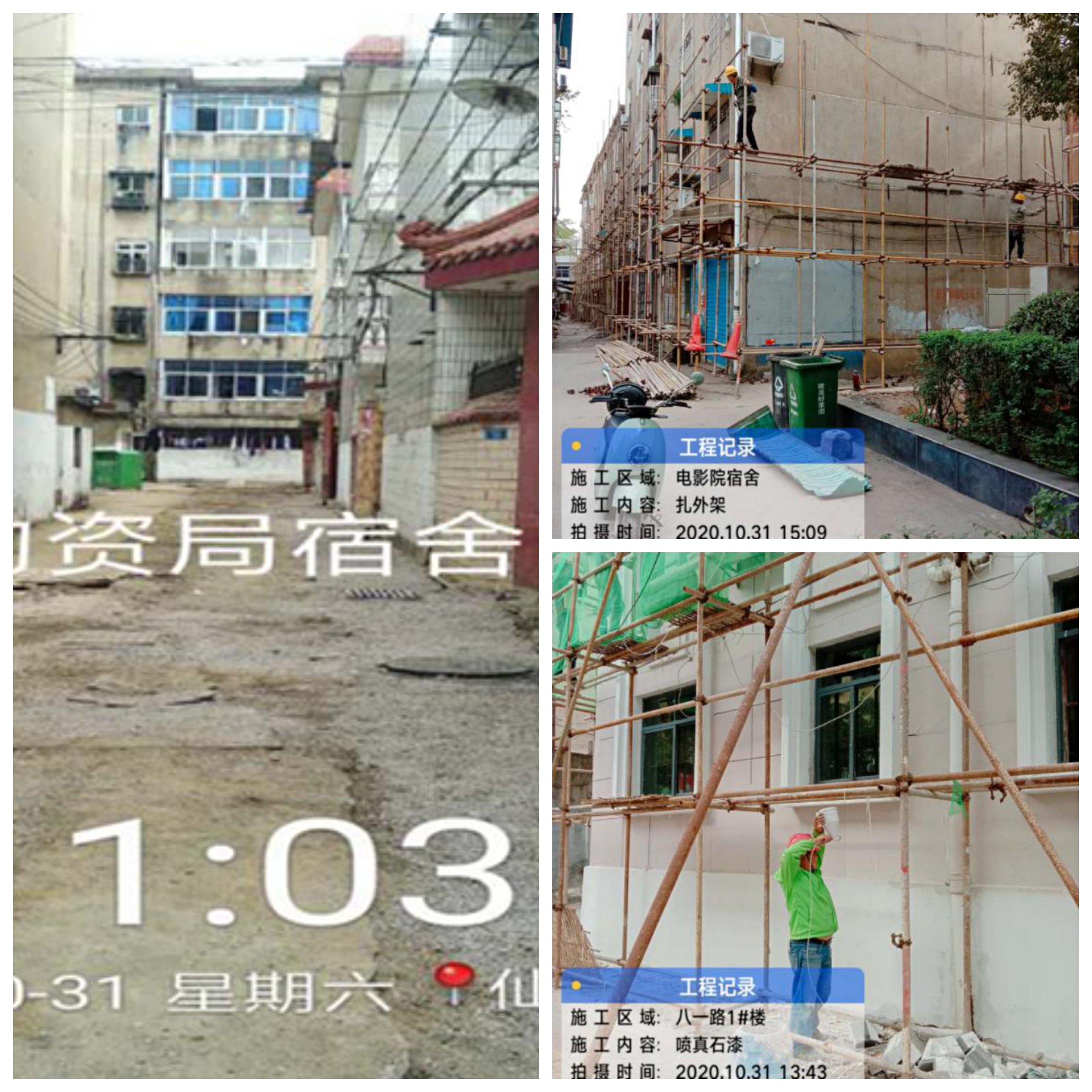 1.大教室新村:外墙喷真石漆;2.小教室新村:外墙空鼓铲除及修补抹灰、外墙批刮腻子;3.邮电小区:4#楼外墙修补抹灰、4#、5#楼外墙喷真石漆、4#、5#外墙贴小面砖及勾缝,2#楼外架挂安全网及铺设脚手板,1#楼外架拆除;4.信用社宿舍:屋面防水卷材施工及保温层施工。