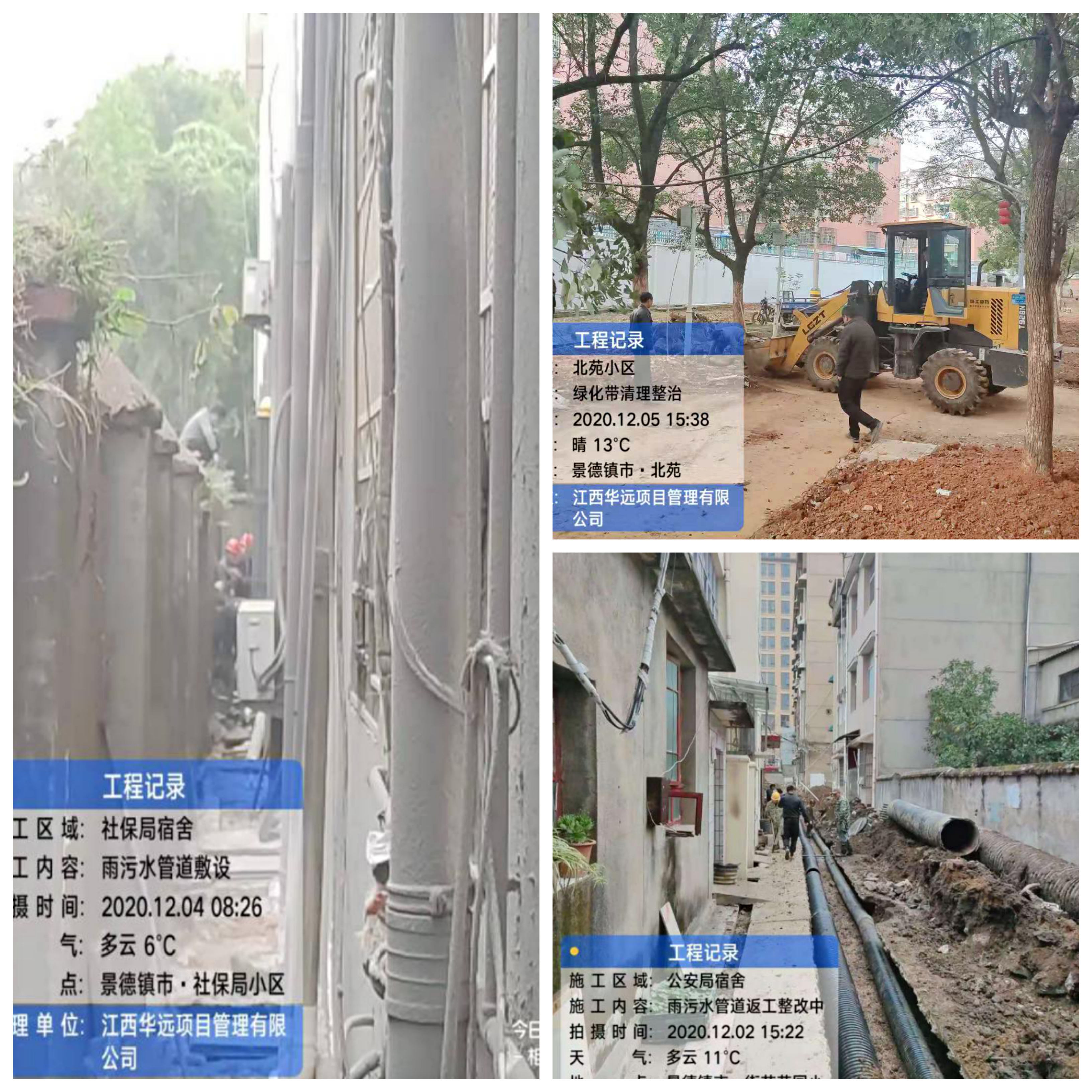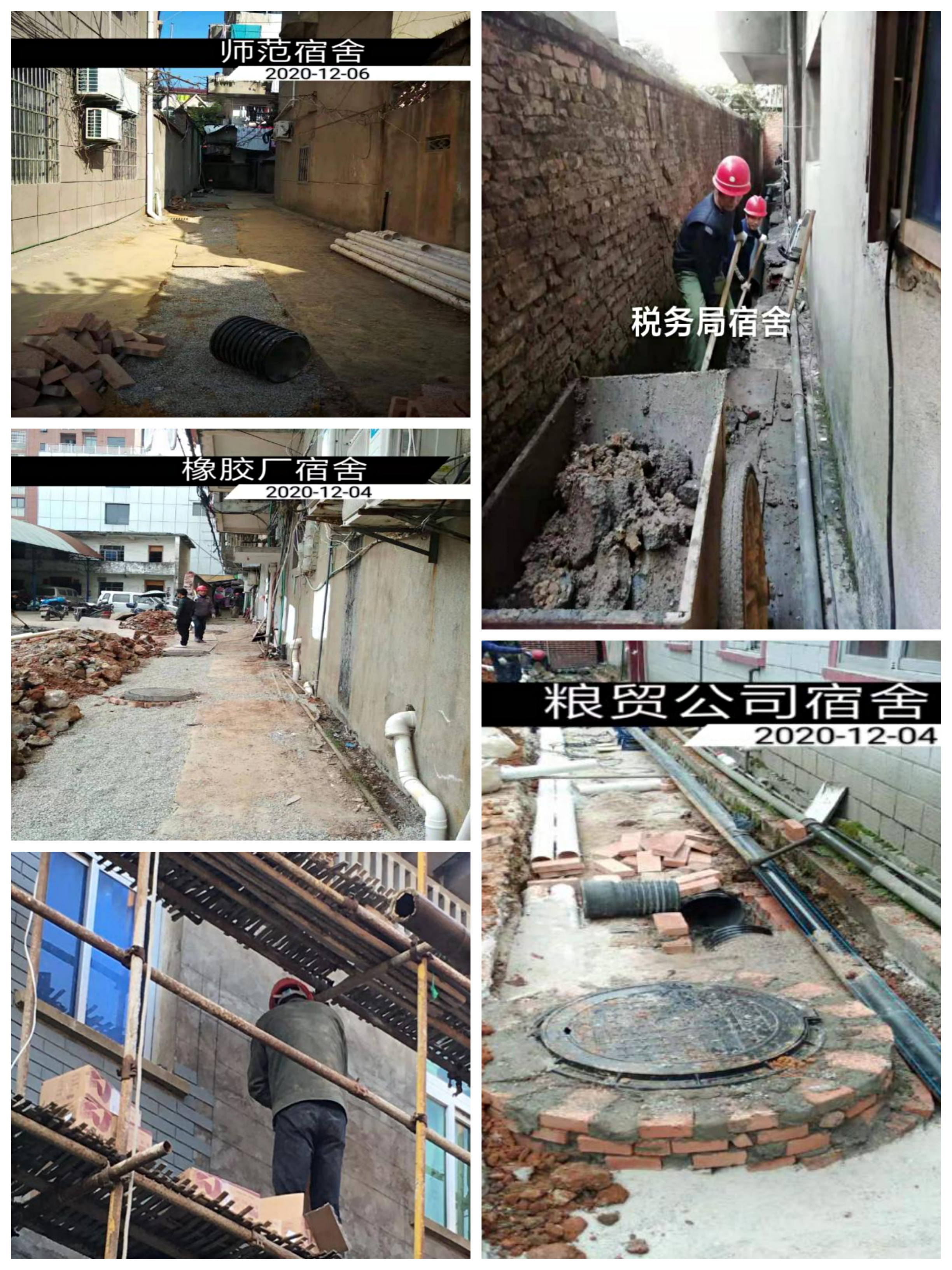 1.南苑小区:雨水管网整改中、屋面保温层施工;2.北苑小区:雨污水管道沟槽开挖敷设管道及砌筑检查井、路缘石更换;3.社保局宿舍:雨污水管网施工;4.为民厂宿舍:清理渣土;5.公安局宿舍:雨污水管网整改中;6.工行宿舍:渣土碎石清理外运、雨污水管网整改中。