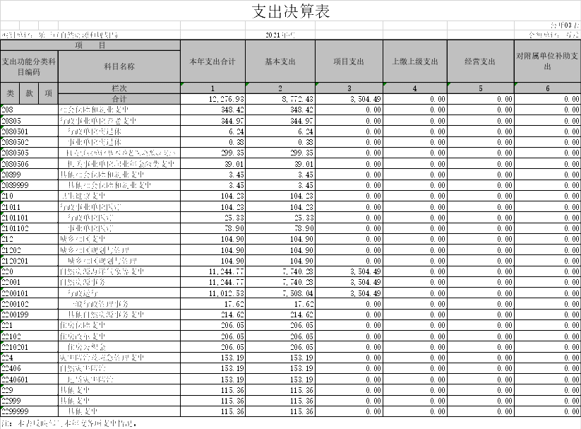 本部门2021年度支出总计12276.93万元,较2020年增加2717.38万元,增长22.13%,主要原因是人员经费和公用经费及项目支出增加;无年末结转和结余。其中按支出功能分类:社会保障和就业支出决算数为348.42万元;卫生健康支出104.23万元,城乡社区支出决算数为104.9万元,自然资源海洋气象等支出决算数为11244.77万元,住房保障支出206.05万元,灾害防治及应急管理支出153.19万元,其他支出115.36万元。按支出性质和经济分类:人员经费支出7426.14万元,占总支出的60.49%;日常公用经费1346.29万元,占总支出的10.97%;项目支出3504.49万元,占总支出的28.54%。