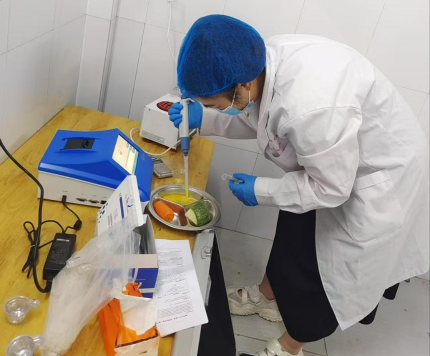2025年5月26日,检测人员身着专业实验服早早来到乐平市幼儿园食堂,严格按照食品快检操作规范流程,紧盯新鲜蔬菜、肉类等重点品种食材,对蔬菜农药残留、肉类新鲜度等关键指标进行快速检测分析。此次活动不仅增强了食品安全监管的针对性和有效性,用快检看得见的结果消除家长看不见的担忧,让老师孩子们吃得安心、吃的放心,还为即将到来的六一儿童节营造安全健康的节日氛围。