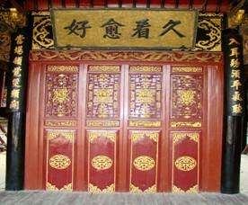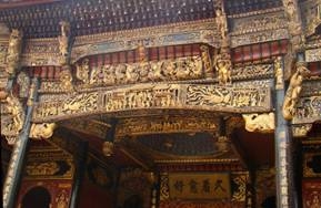 戏台构架坚固稳定、奇巧复杂、木构件装饰通体施金,金碧辉煌。戏台用材考究、硕大、大量诸用雕刻,雕刻图案精美、内容层次分明丰富。雕刻图案有龙、凤、人物故事、瑞禽瑞兽、缠枝花等等。主要部位的雕刻表面贴金。 该戏台以建筑奇巧之复杂、设计之巧妙、雕刻之精美、雕槊之精工、布局之繁华、装饰之豪华而著称,当属乐平古戏台之极品。