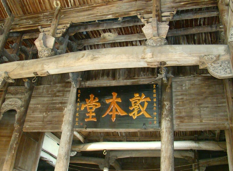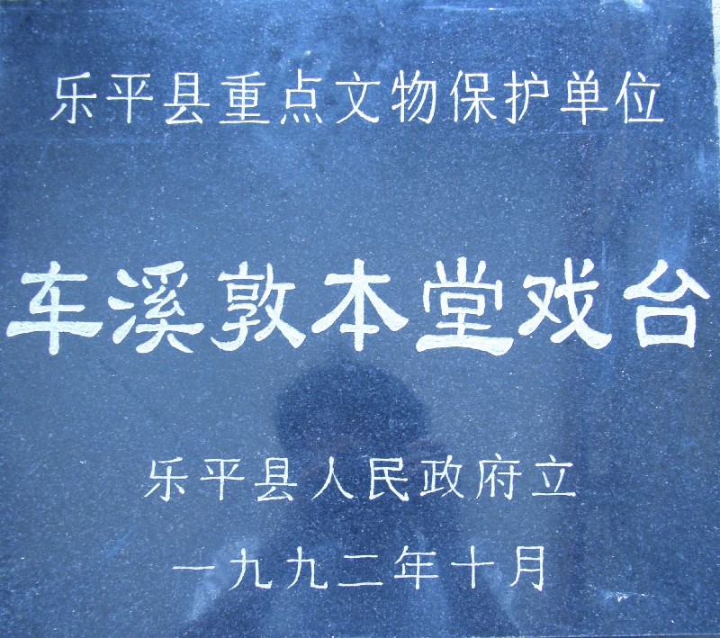 敦本堂戏台,位于乐平市涌山镇车溪村西北口,世为朱氏宗祠,坐南朝北。祠堂前有一口半月形聚星池,周围环境清幽古雅。建筑总占地2000平方米,通面阔30米,通进深65米。整个建筑分为四进,前进增添一座门面及小院,而后依次牌楼式八字大门、单面戏台、前天井与两侧边廊为二进,再拾三级台阶上檐廊入第三进为正堂,第四进有后天井及寝堂、客楼、神位与两边的厢房、陪屋等。敦本堂戏台始建于清代乾隆丙寅年(公元1746年),越五年落成,同治庚午年(公元1870年)“遵旧制婺图”,又五年复竣。戏台为重檐双戗角歇山顶附两硬山,三间四柱三楼式。台高1.5米、台宽11.2米、台深9.8米、台口净高3.8米。戏台有三度门,明间演出区6.1×5.58米。1983年乐平县人民政府将车溪敦本堂戏台列为县第一批重点文物保护单位。现状保存完整,外观墙体坚固如初,整体和谐有致;内部构架结构稳定,正厅、后堂依旧坚挺。敦本堂建筑以规模宏大、平面功能复杂,戏台隆重精美为其特色,是乐平戏台明末清初滥觞时期的代表,被视为古饶、徽二州那种“山高岭密、水急滩险地域特征”戏台建筑的典范,有着浓厚的地方特色,是乐平特有的文化资源,是江西地方文化的重要组成部分,是我国珍贵的民族文化遗产。1992年10月,公布为乐平县重点文物保护单位。