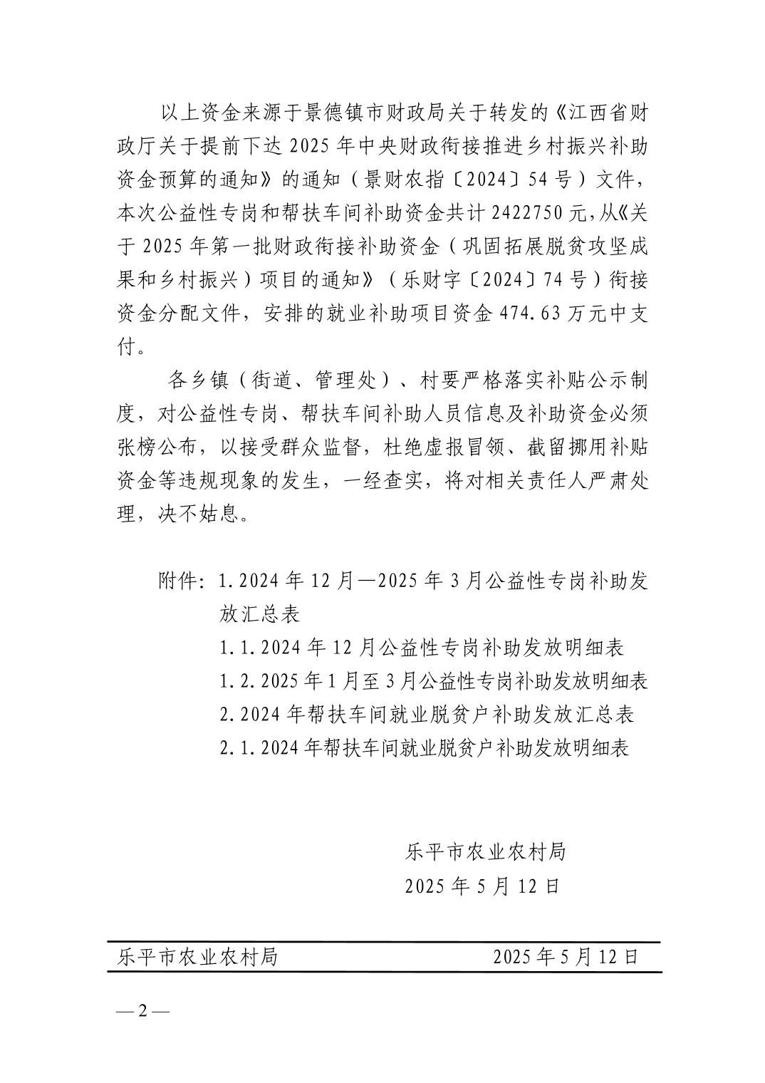 关于发放2025年第一季度公益性专岗就业补助及帮扶车间就业补助的函