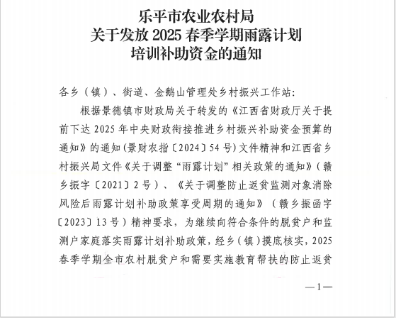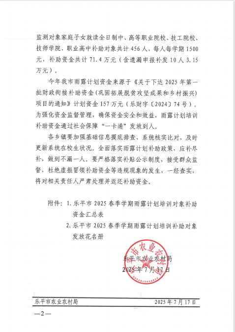 关于发放2025春季学期雨露计划培训补助资金的通知