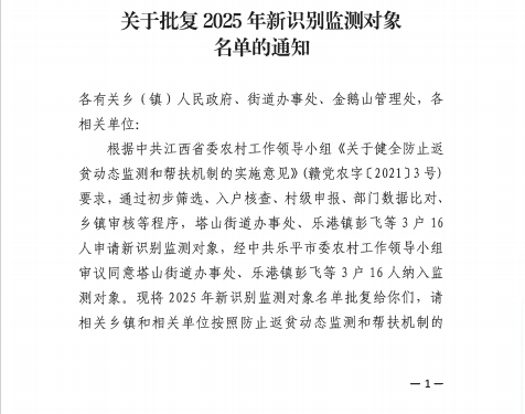 关于批复2025年新识别监测对象名单的通知