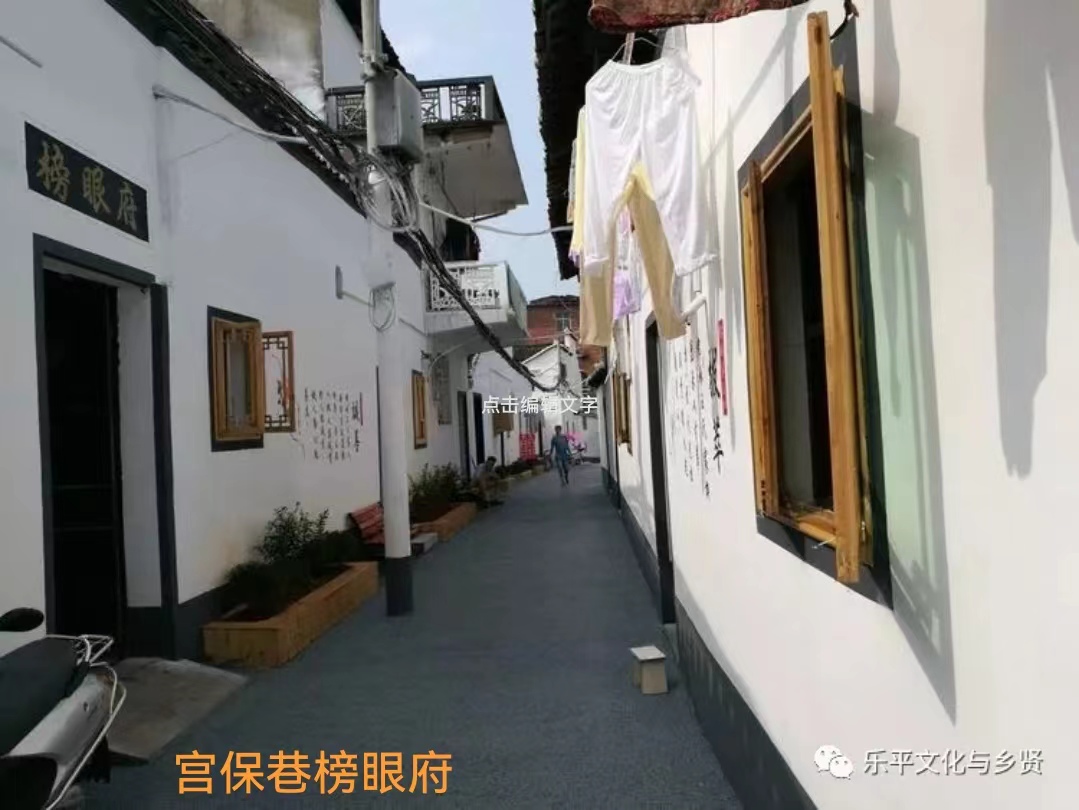 - ---乐平籍乡贤科考中式后赐建府第之处。如“宫保巷”。翥山西路(原西大街)至西后街有一条宫保巷,因清代嘉庆年间榜眼、官至吏部尚书、赠太子太保的汪守和在此巷建府第,府门口上镶“榜眼及第”四个金字,故名“宫保巷”。